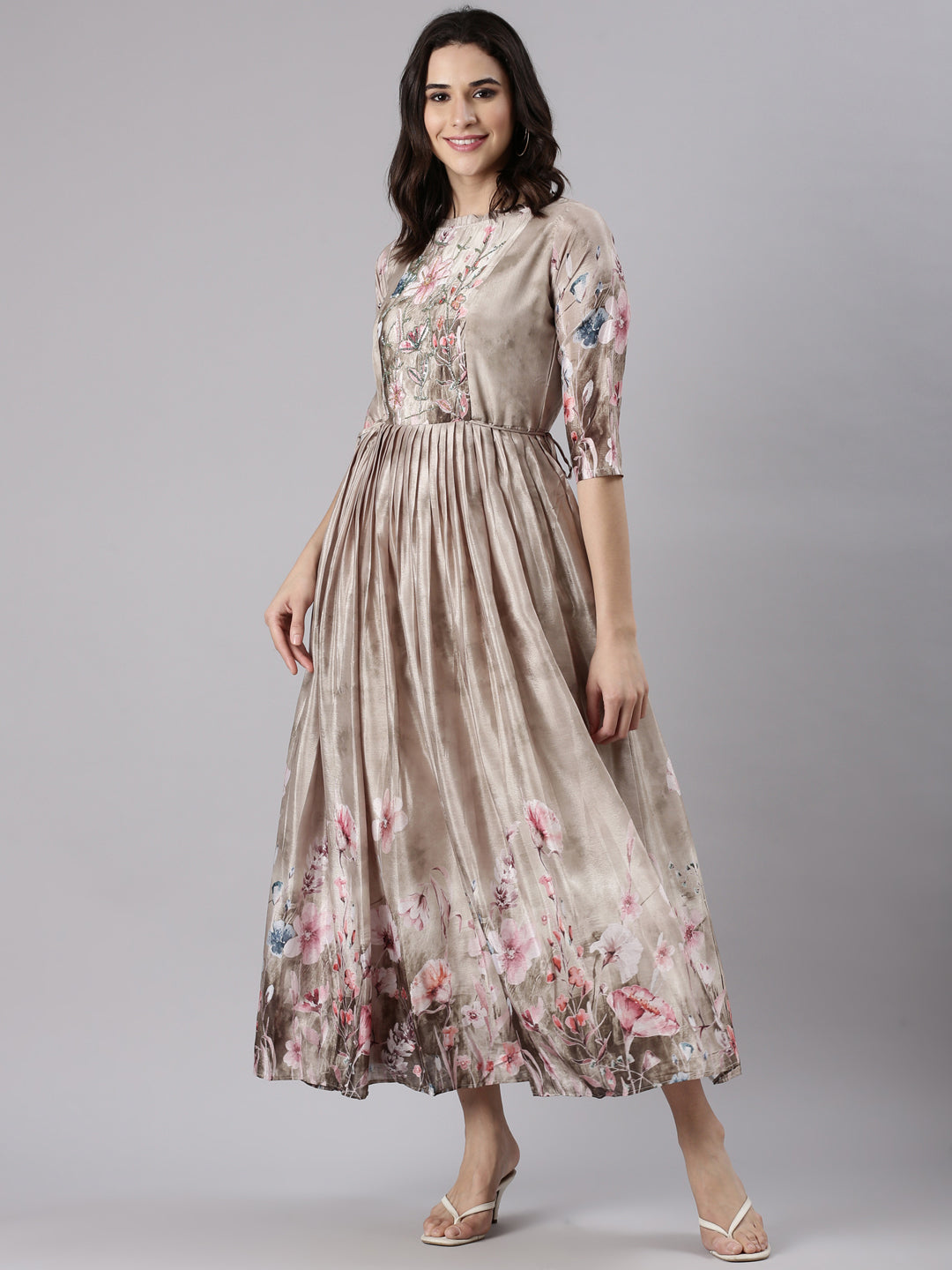 Beige Silk Printed Long Frock