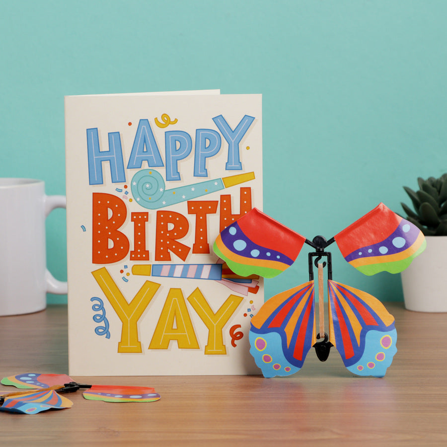The Butterfly Birthday Card – A pet butterfly hides inside and flutters out when the card is opened. The front says “Happy Birth yay” and the inside reads “May you forever spread your wings and fly!” (Cuteness overload? Yes.)