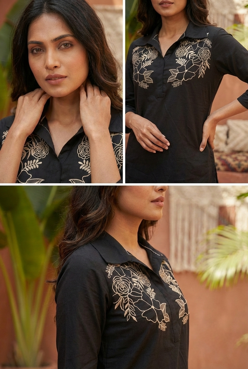 Black Cotton Floral Hand Embroidery Coord Set Elevate your ethnic wardrobe with this stunning coord set, thoughtfully crafted from soft cotton fabric. Each piece features intricate hand embroidery with delicate floral motifs, showcasing traditional artistry and attention to detail. The coordinated top and bottom design makes styling effortless while maintaining an elegant, put-together look. Perfect for festive occasions, casual gatherings, or whenever you want to celebrate your cultural heritage with confidence. Comfortable, versatile, and beautifully made—this set is a wonderful addition to any collection.