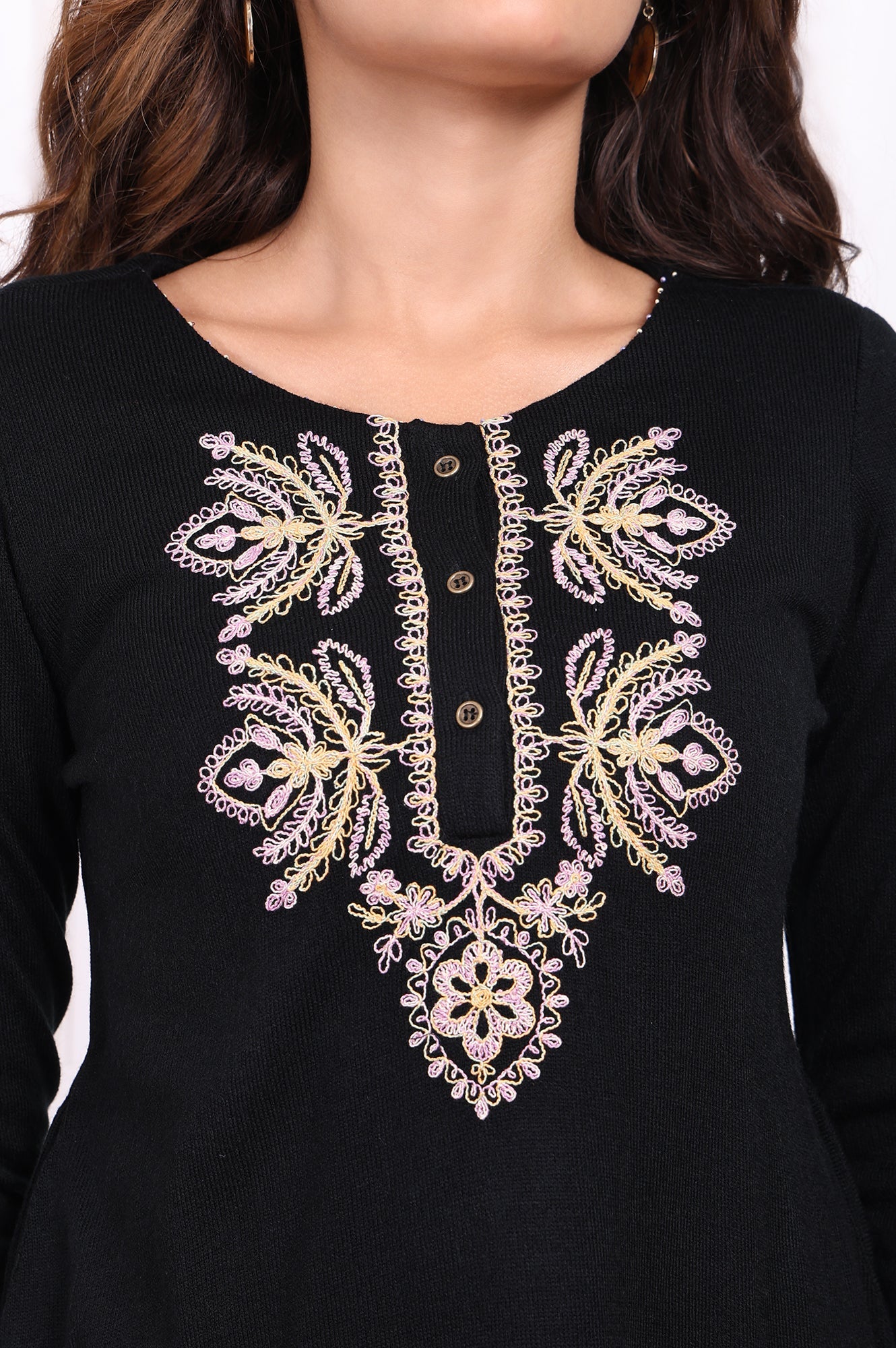 Refined and versatile, this black acrylic tunic for women is a wardrobe essential. Featuring intricate thread embroidery on the neckline and cuffs, this straight silhouette tunic with side slits offers a flattering fit. The soft acrylic fabric ensures comfort and warmth, making it perfect for casual outings or festive gatherings. Elevate your style with this elegant and versatile piece.