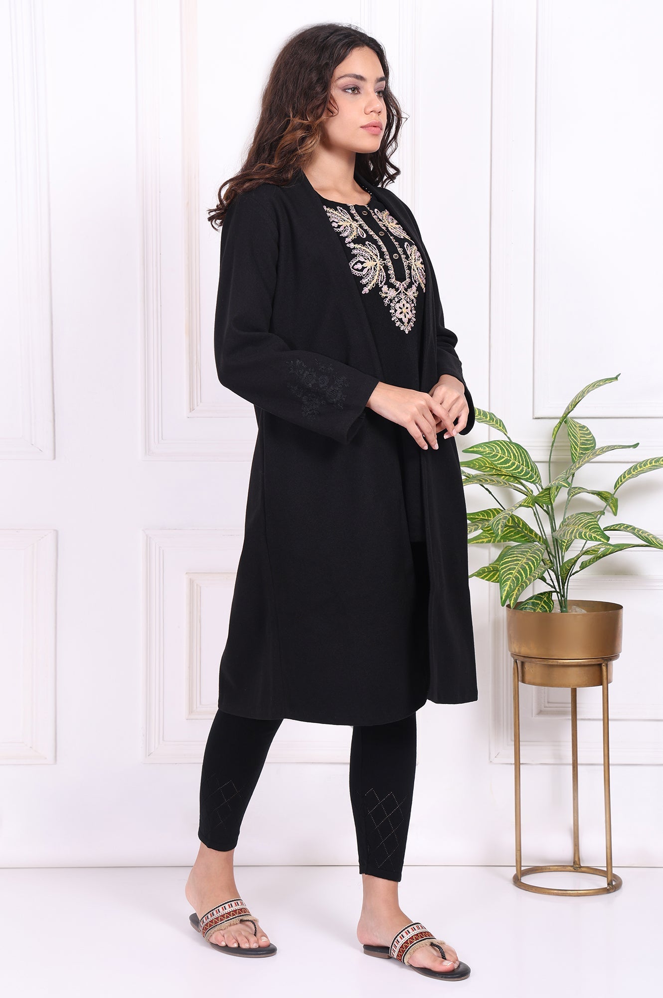 Effortlessly chic! This black solid straight coat for women is a wardrobe essential for the season. Designed with a clean, minimalist silhouette, it features a timeless open-front style and long sleeves with subtle embroidery details. Perfect for layering over casual or formal outfits, this coat offers a versatile look that transitions seamlessly from day to night. Pair it with tailored trousers or skinny jeans for a polished yet relaxed vibe. The straight hemline and woven fabric ensure a comfortable fit, making it ideal for winter outings. Elevate your style with this elegant creation that blends modern simplicity with understated sophistication.