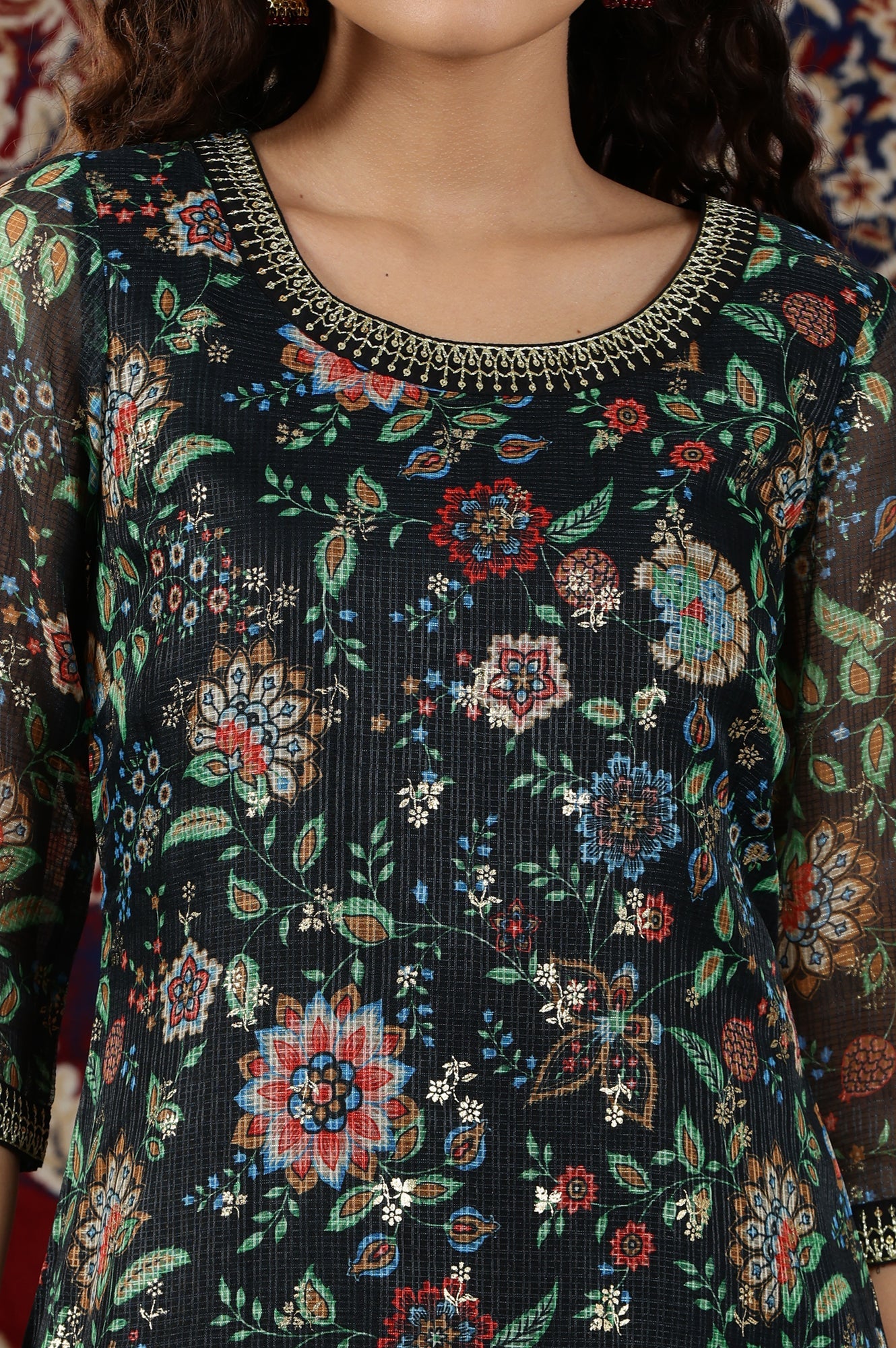 Black Floral Printed Straight Kota Kurta with Embroidered Neckline