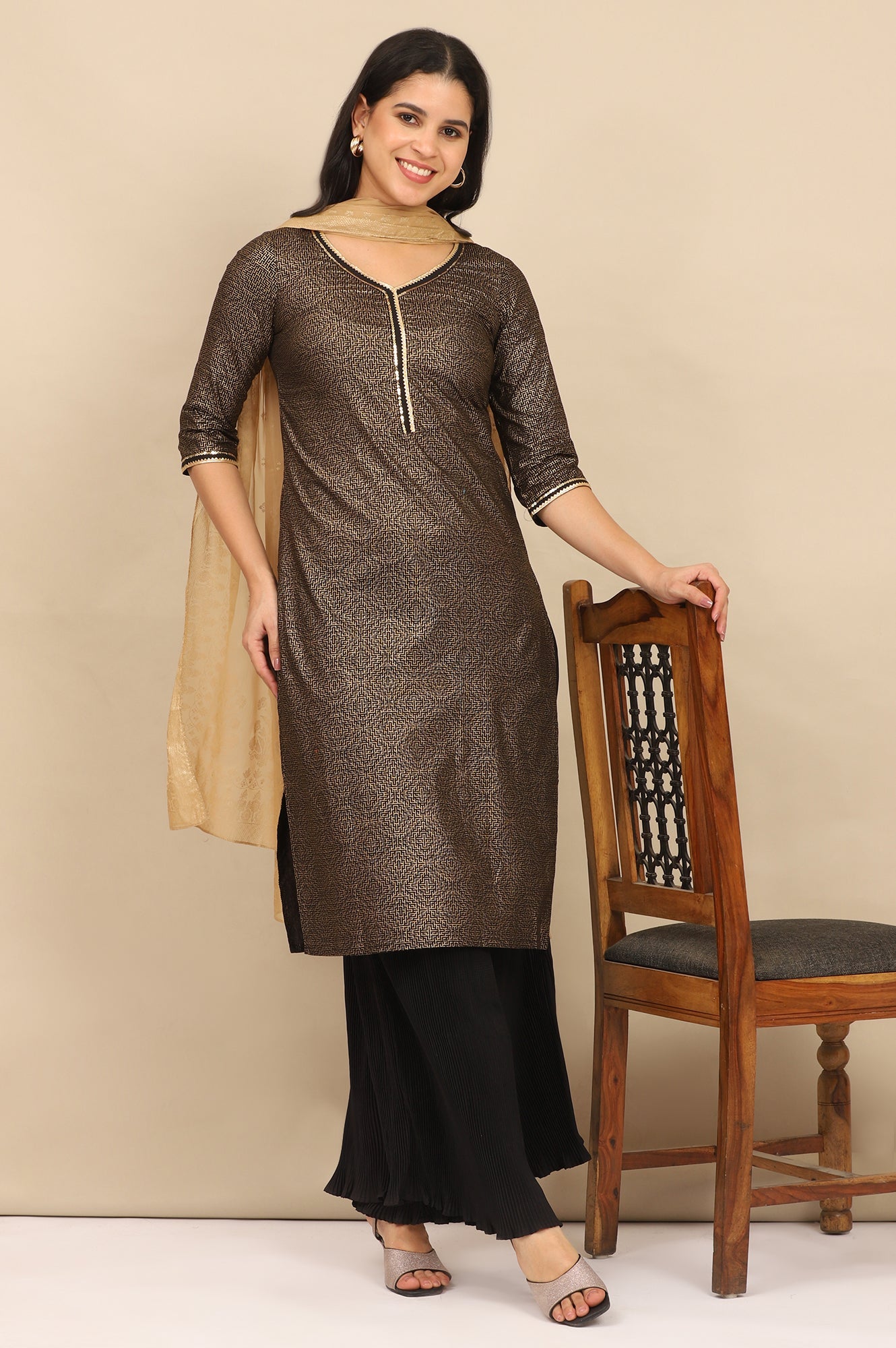 The Black Embellished Straight Kurta and Pleated Flared Palazzo Set is a perfect blend of sophistication and festive charm. The straight-cut kurta is adorned with intricate foil prints and delicate embellishments, adding a subtle shimmer and elegance. Paired with pleated flared palazzo pants, the ensemble offers a flowy and graceful silhouette that enhances movement and comfort. The matching dupatta, featuring refined detailing, completes the look with a touch of finesse. Ideal for special occasions and celebrations, this set effortlessly combines traditional aesthetics with contemporary style.