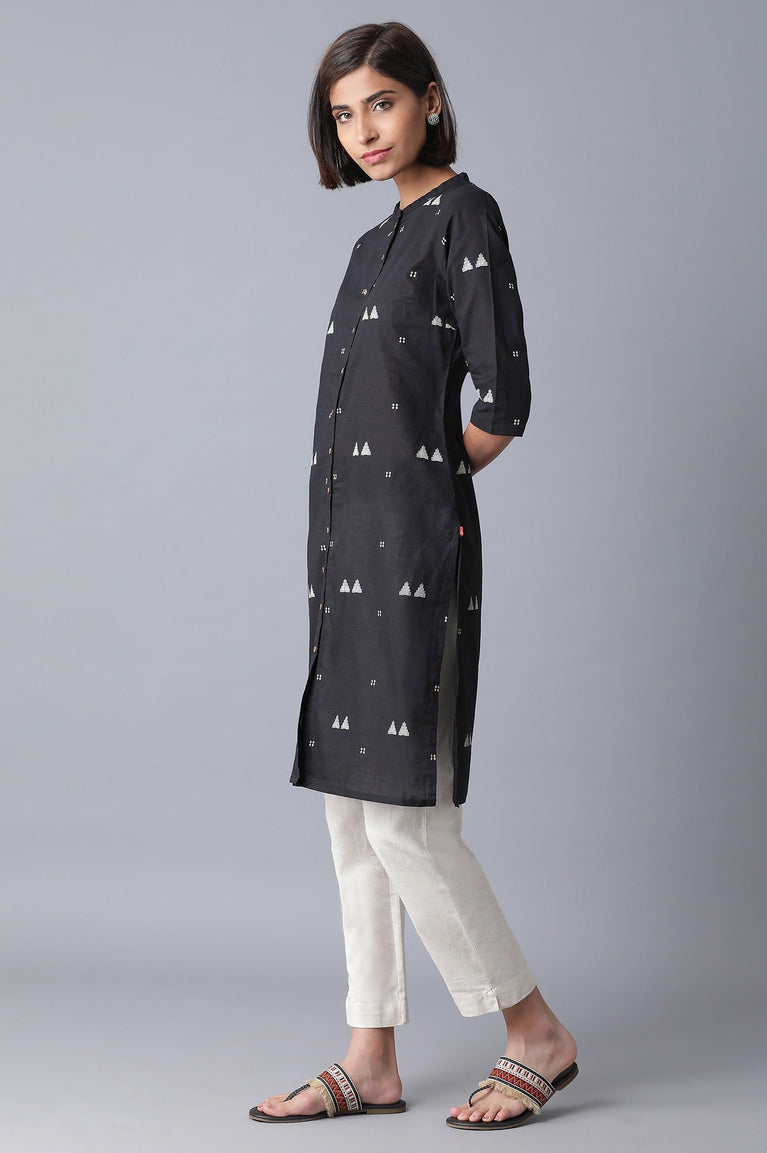Upgrade Your Casual Wardrobe With This Stylish Geometric Printed Shirt Style Kurta. It Has Mandarin Collar With Button Placket And Curved Hemline.