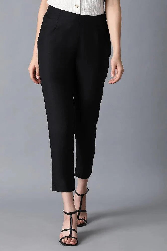 Black ankle length trousers with elasticated back and zipper closure on one side.