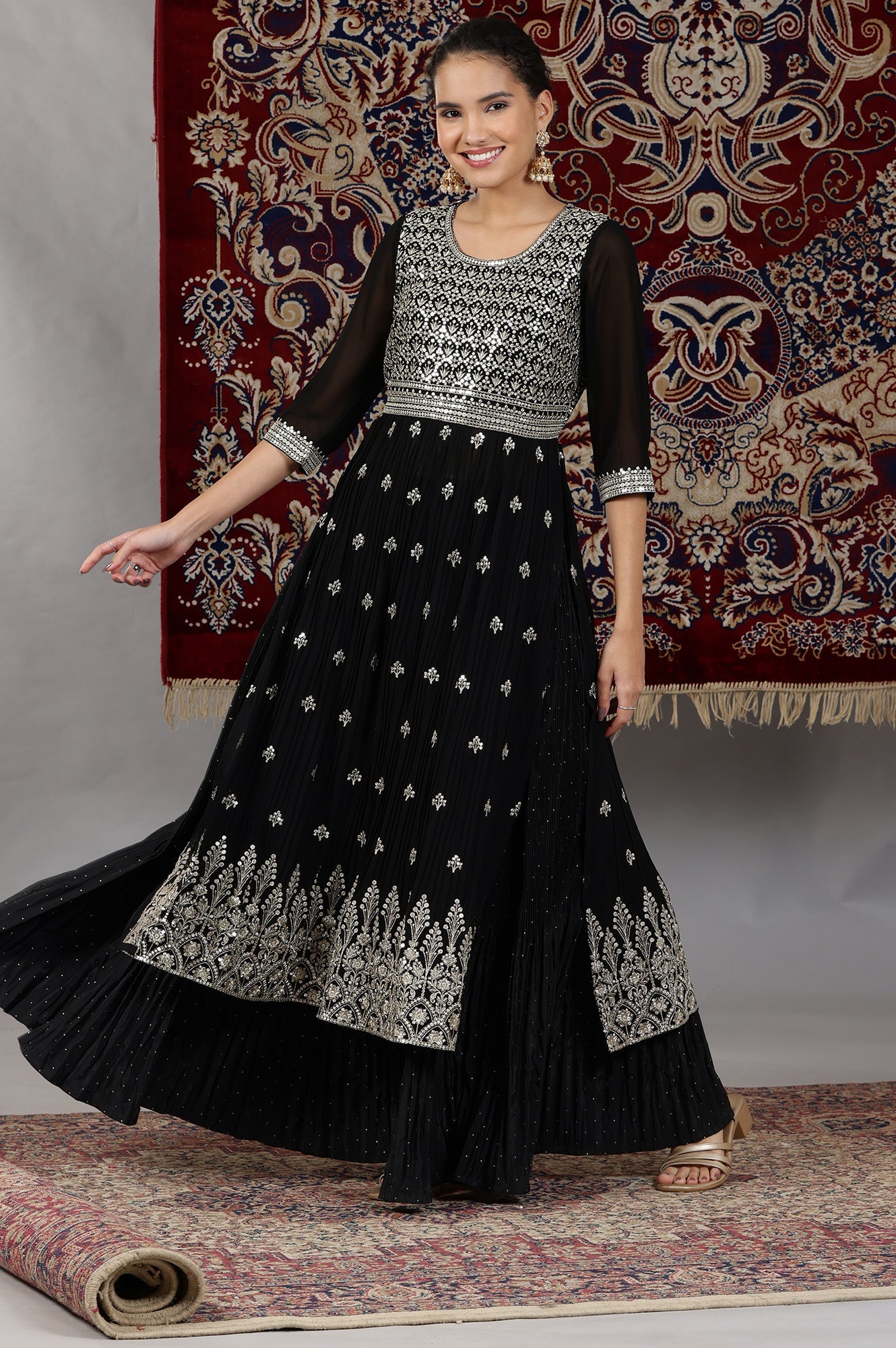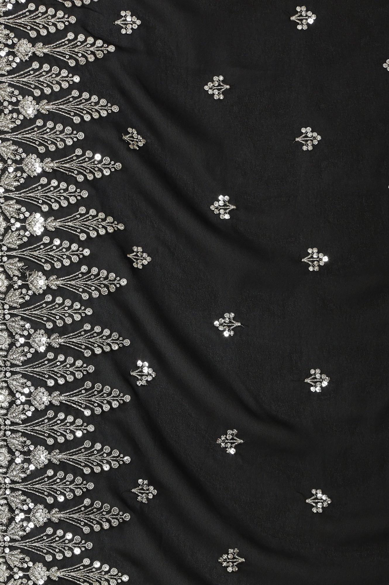 Black Zari Embroidered Flared Kurta, Pleated Skirt and Dupatta Set