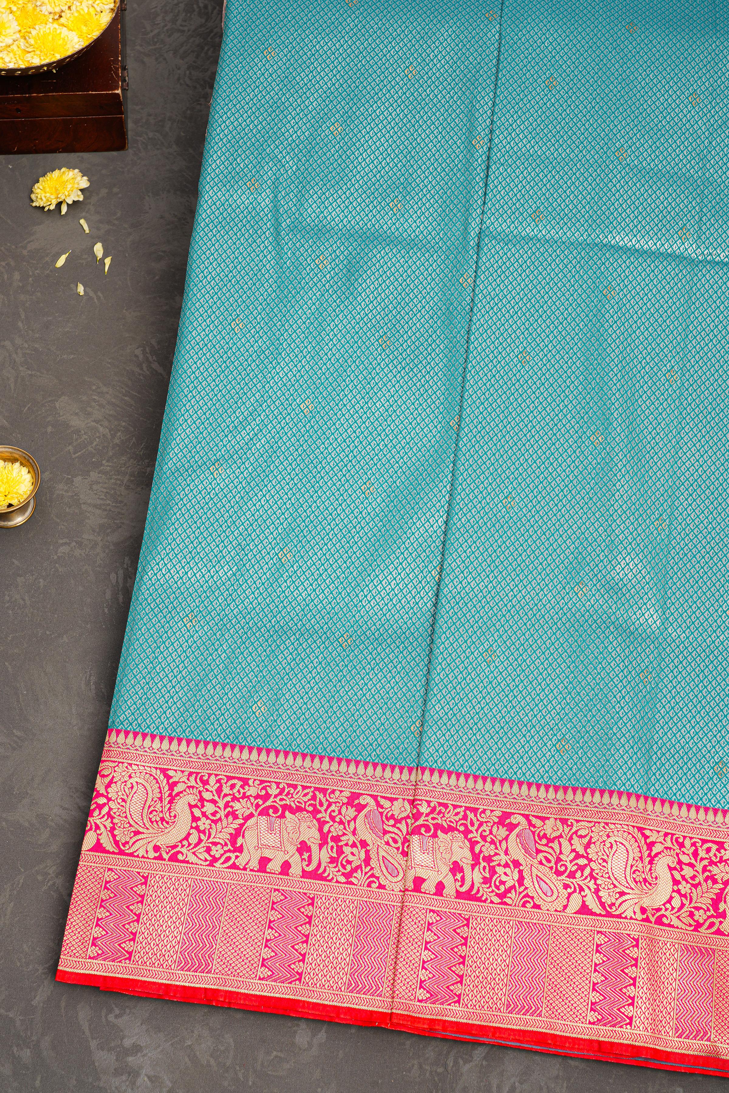 Latest BLUE BROCADE SILK Saree with CONTRAST ZARI border. This saree comes with CONTRAST WITH BORDER SILK blouse.