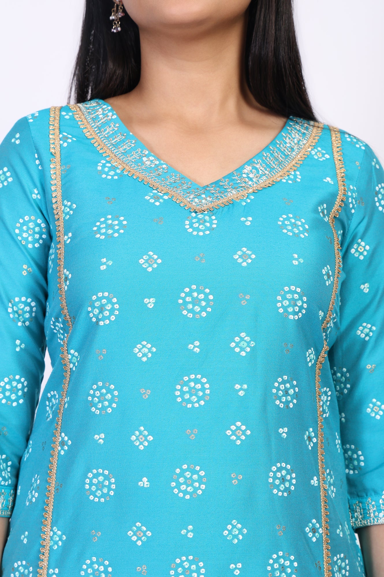 Blue Bandhani Printed Straight Rayon Kurta with Lace