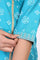 A vibrant expression of festive grace, this stunning kurta for women is a masterpiece of traditional design and modern comfort. Crafted in a breathtaking Azure Sky hue, it’s a piece designed to make you shine at any celebration. It's the kind of apparel you'll feel instantly radiant in. The silhouette is a timeless straight cut that flows effortlessly, offering both elegance and ease of movement right down to its classic straight hemline. This ethnic tunic features a flattering V-neckline, which is highlighted with delicate, shimmering ornamentation that serves as the yoke's focal point, beautifully framing the décolletage. Adding to its charm are the three-quarter sleeves, which provide graceful coverage and end in finely detailed cuffs that echo the intricate design at the neck. Subtle tape detailing runs vertically along the seams, a thoughtful touch that adds a structured yet decorative element to this beautiful garment. The all-over traditional print is inspired by classic motifs, rendered in a crisp pattern that feels both authentic and wonderfully fresh. This printed straight kurta is fully opaque for complete confidence and features comfortable side slits for ease of movement. It's a single, standout piece that forms the perfect foundation for your festive look.