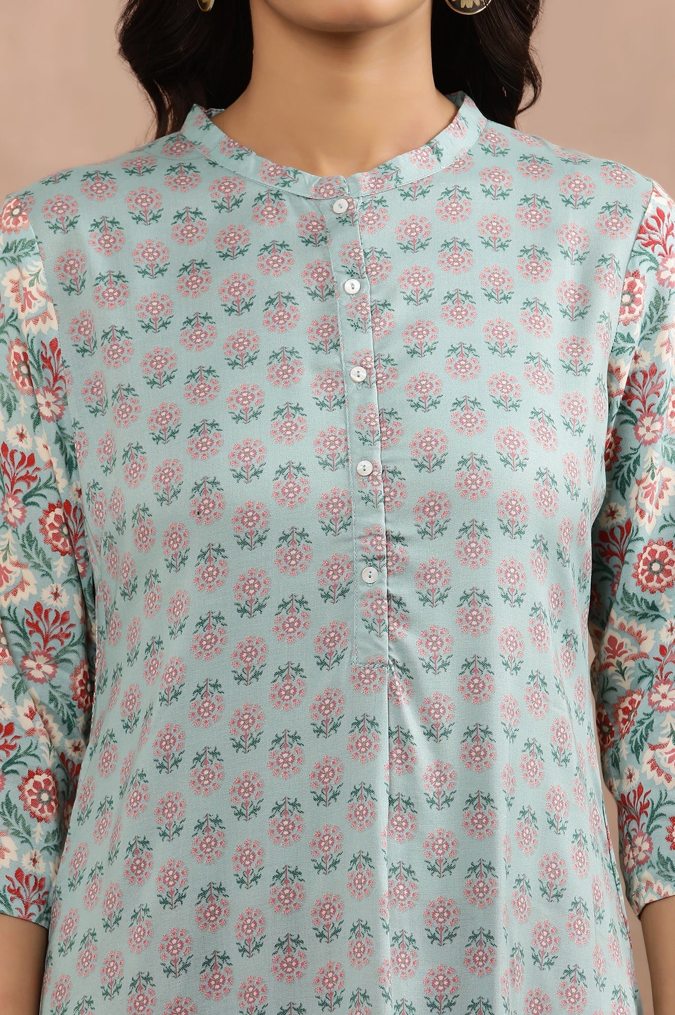 Amp Up Your Office Look In This Pretty Blue Printed Straight Button Down Kurta. It Is Paired With Conrasting Pink Tights.