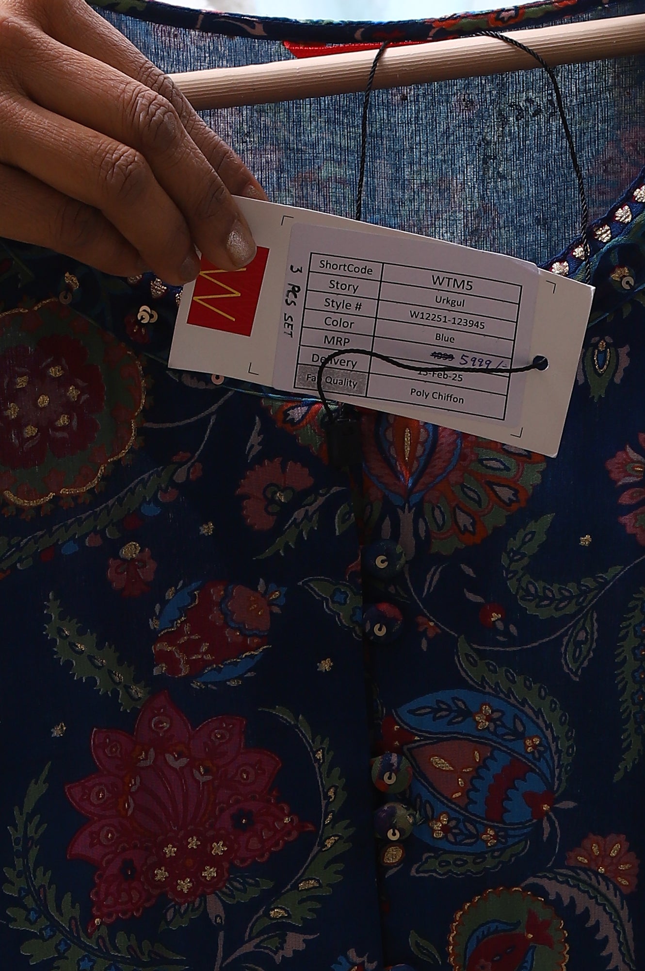 This enchanting blue Chintz floral print tiered gathered Anarkali kurta is a graceful blend of elegance and flowy charm. Crafted in lightweight chiffon, it drapes beautifully, creating a flattering and ethereal silhouette. The round neckline is adorned with a delicate border trim detail, which is also echoed on the sleeves, adding a refined touch to the design. The tiered gathering enhances movement, making it a perfect choice for festive occasions, summer soirées, or elegant daywear. Pair it with minimal jewelry and classic footwear for a timeless and effortlessly chic look.