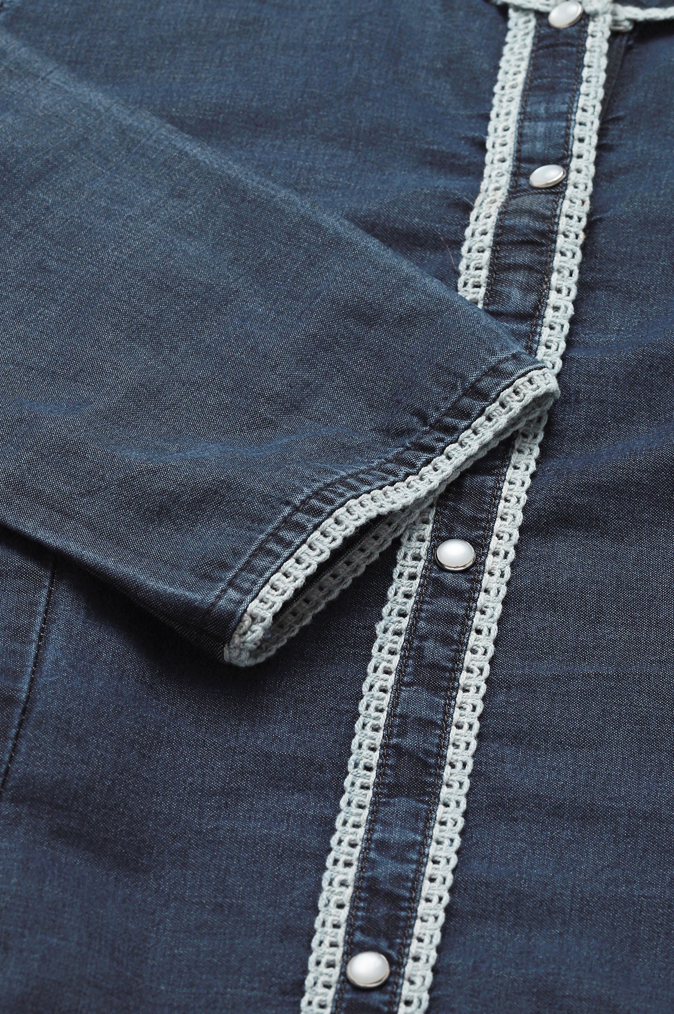 Prepare to get overwhelmed by a swirl of compliments by putting on this exquisite denim dress. It has an elegant lace detail running down the placket and the sleeves, and also features a loop-and-tie detail on both the sides of the waistline. Pull the ties as per your comfort and step out looking like an absolute diva!
