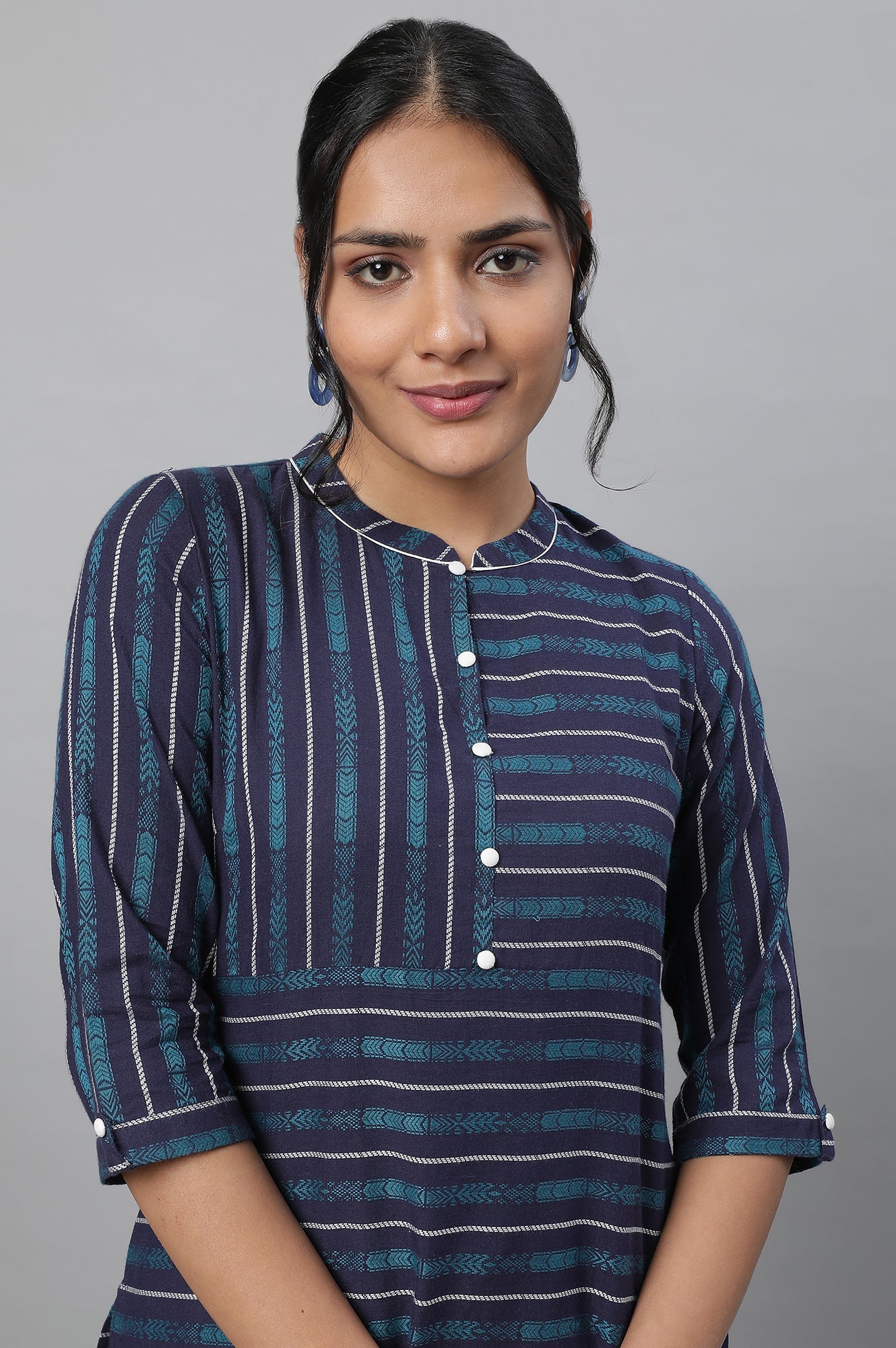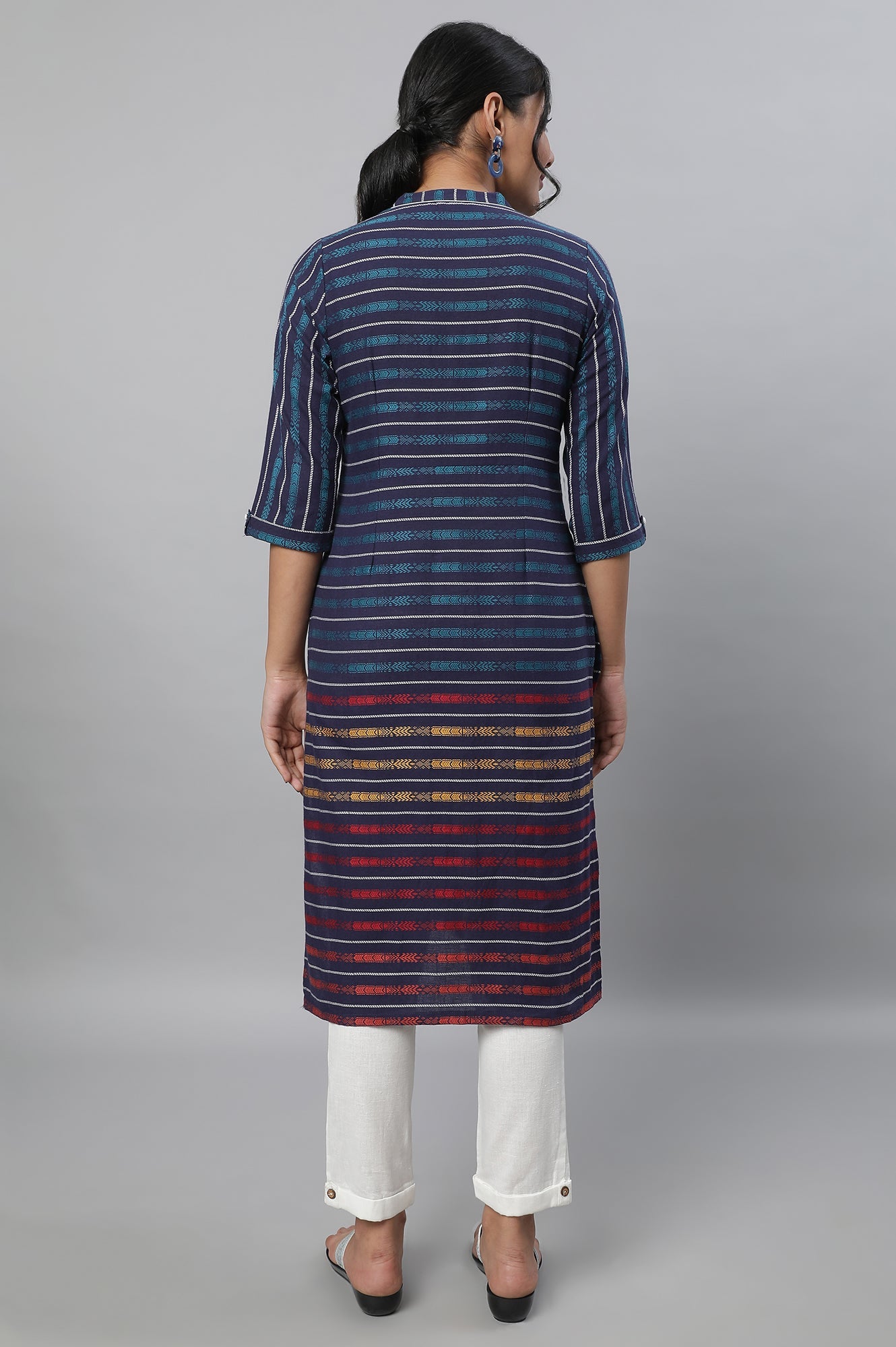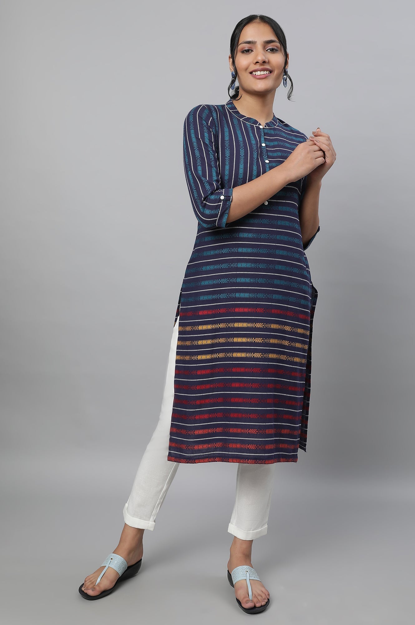 Get ready for the light festive look in this pretty blue printed kurta set. The set has straight kurta in band collar and paired with white trouser pants.