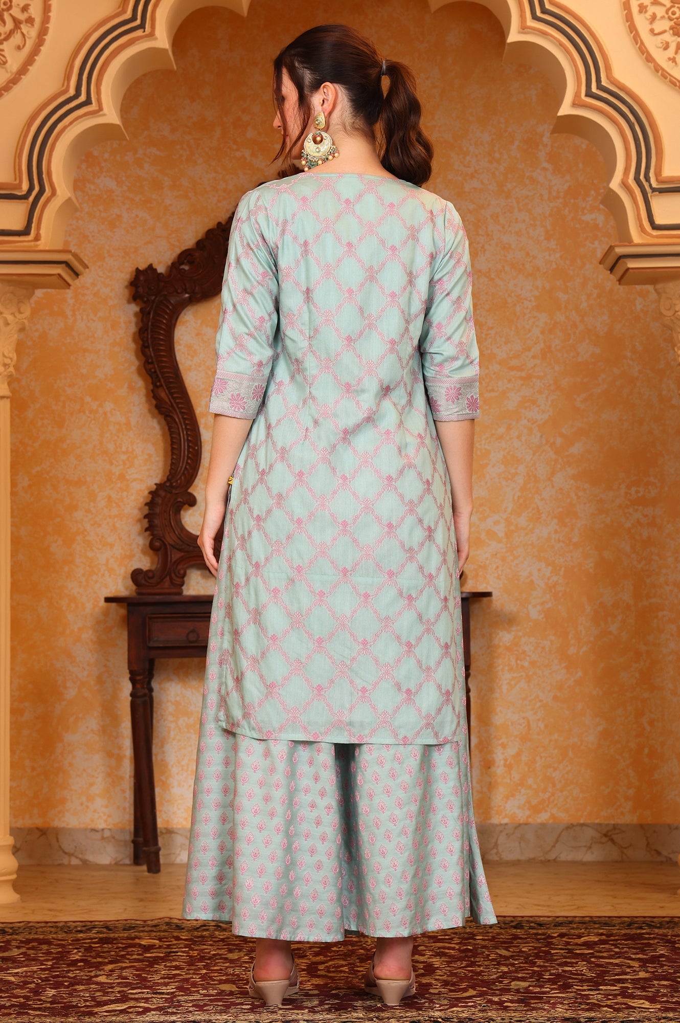 Step into festive elegance with Aurelia’s Powder Blue Ethnic Motifs spaghetti Crop Top with jacket set. The woven jacquard fabric, adorned with delicate beads ornamentation, creates a luxurious texture that feels soft against the skin. The sleeveless crop top with a boat neck offers a contemporary twist, while the mid-rise palazzo pants ensure effortless movement. The straight hemline jacket completes the look, adding layers of sophistication. Perfect for festive gatherings, this ensemble blends traditional charm with modern silhouettes. Pair it with statement earrings and heels for a polished look. Hand wash recommended to maintain its intricate detailing and vibrant hues.