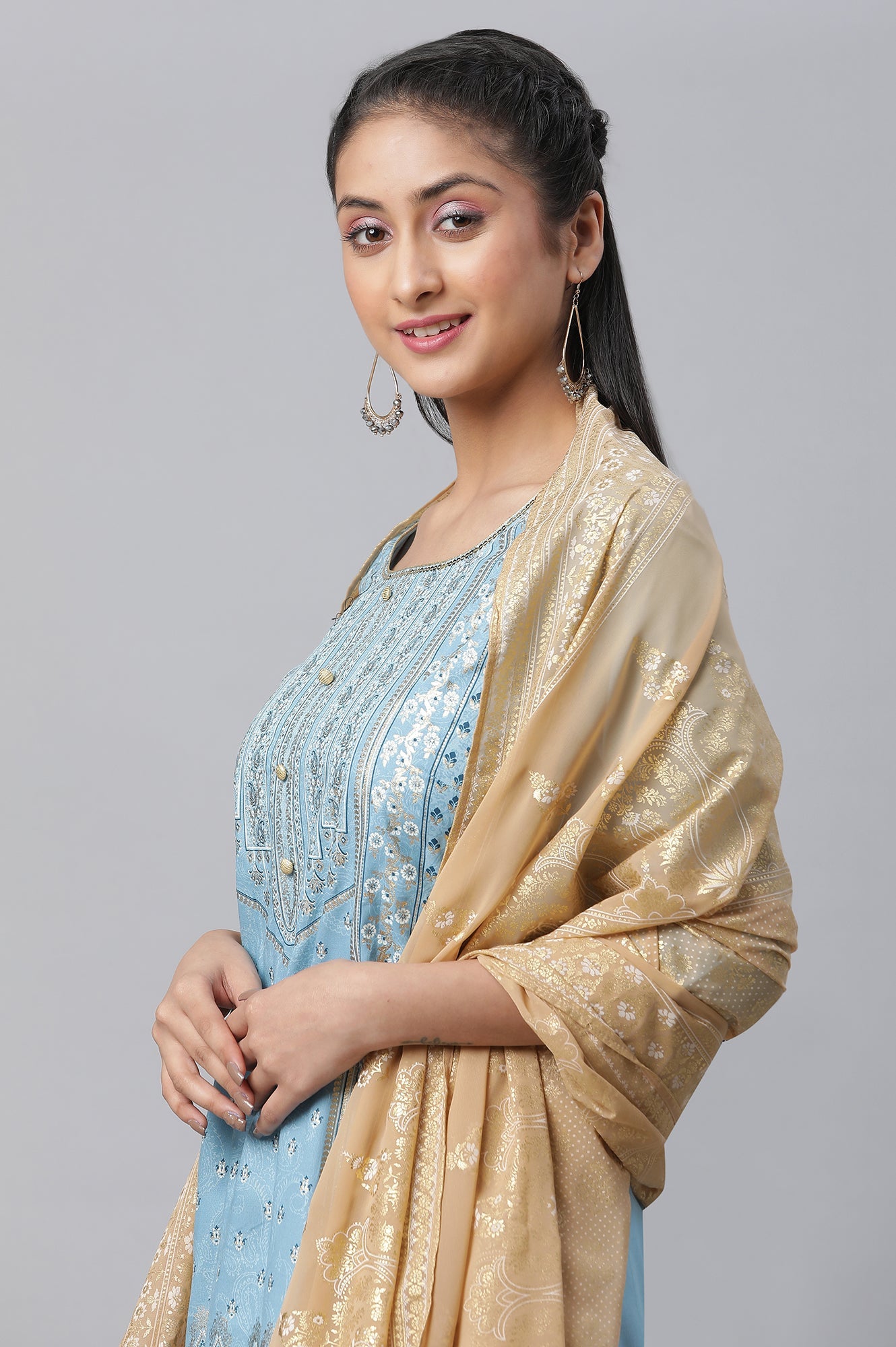 Look effortlessly stylish in this stunning ethnic pick from Aurelia kurta set collection. The set includes blue embellished straight kurta which is paired with gold printed skirt and dupatta.