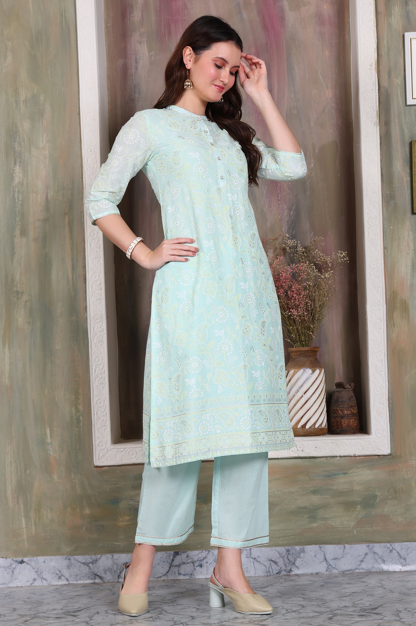 Discover the allure of this sky light blue kurta and palazzo set, meticulously crafted from pure cotton for a relaxed fit. The kurta features a stunning foil print and delicate tape ornamentation, creating a harmonious blend of tradition and modernity. The band collar and 3/4th regular sleeves add a touch of sophistication, making it perfect for both casual and formal occasions. The solid palazzo offers comfort and versatility, completing the ensemble. Pair this set with statement earrings and elegant footwear for a chic ethnic look. Embrace sustainable fashion with this eco-friendly outfit, designed for the modern Indian woman who values quality and style.