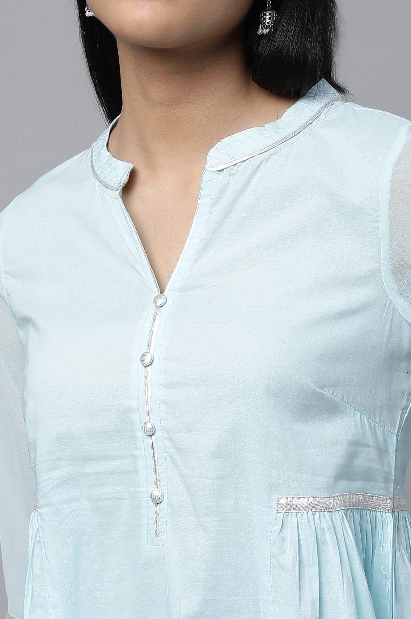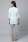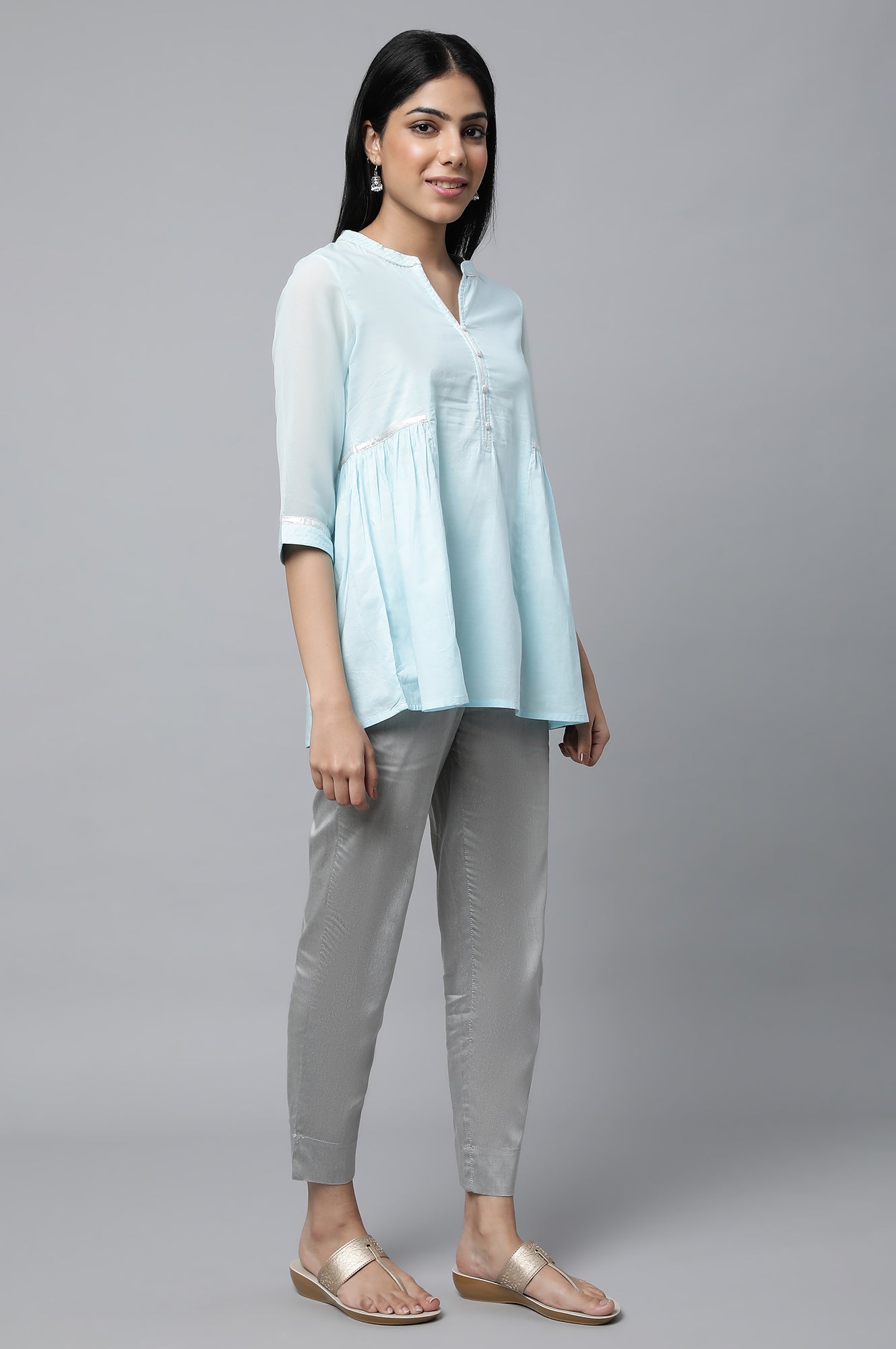 Get a smart office lunch look in this pretty and chic blue gathered kurta set. The set has solid cotton kurta with elegant details. It is paired with grey solid trousers.