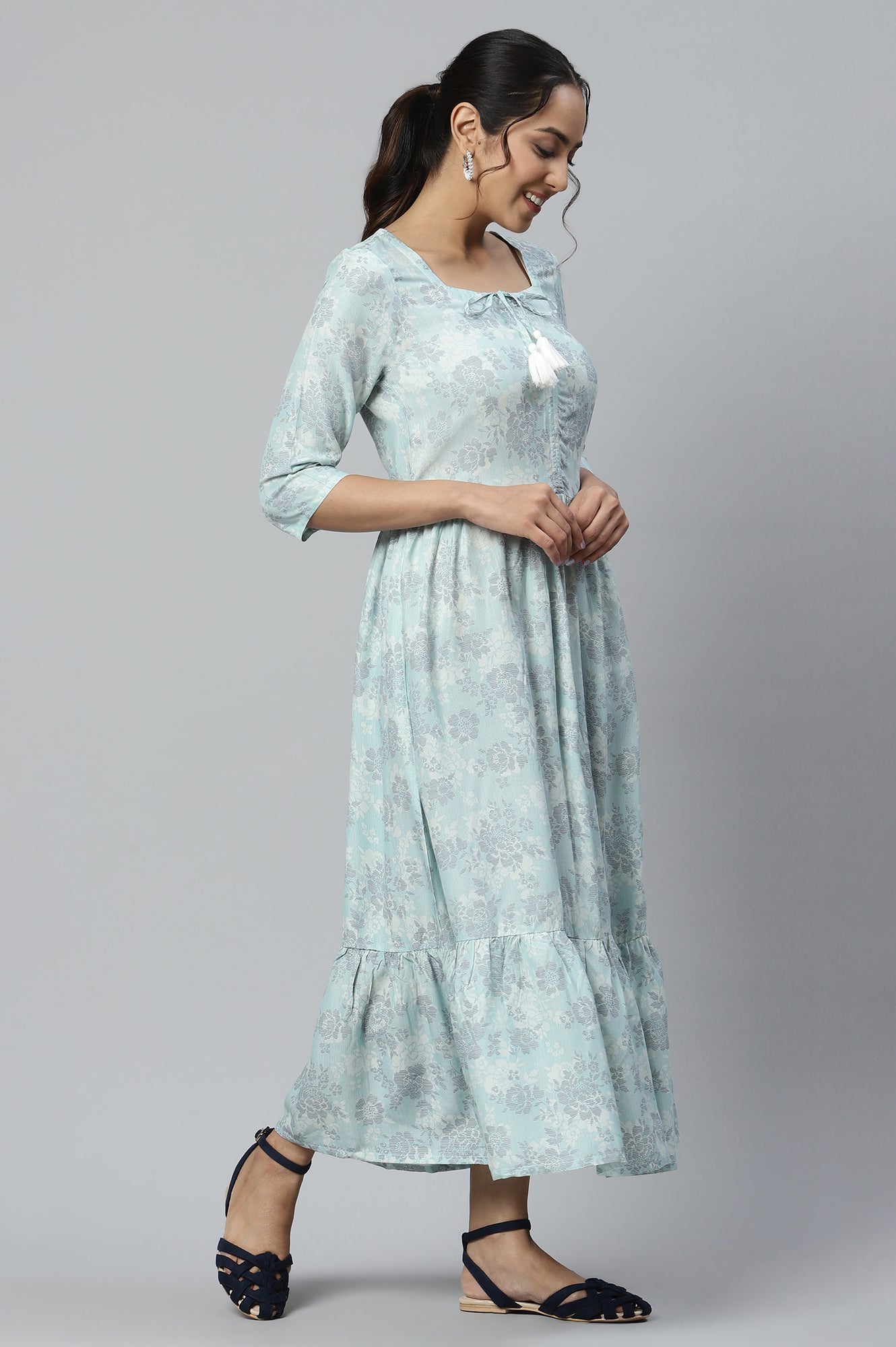 Blue Gathered Rayon Midi Dress