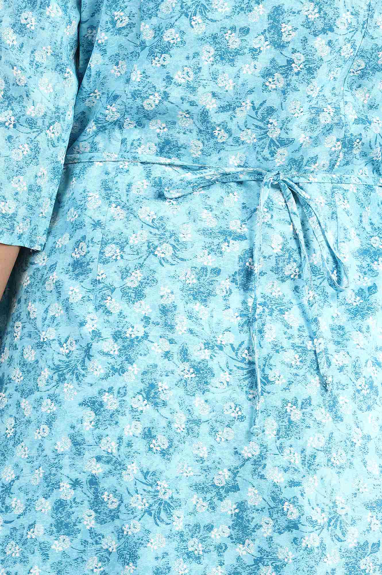 This blue mandarin neck 3/4 sleeve kurta has floral detail and side slits