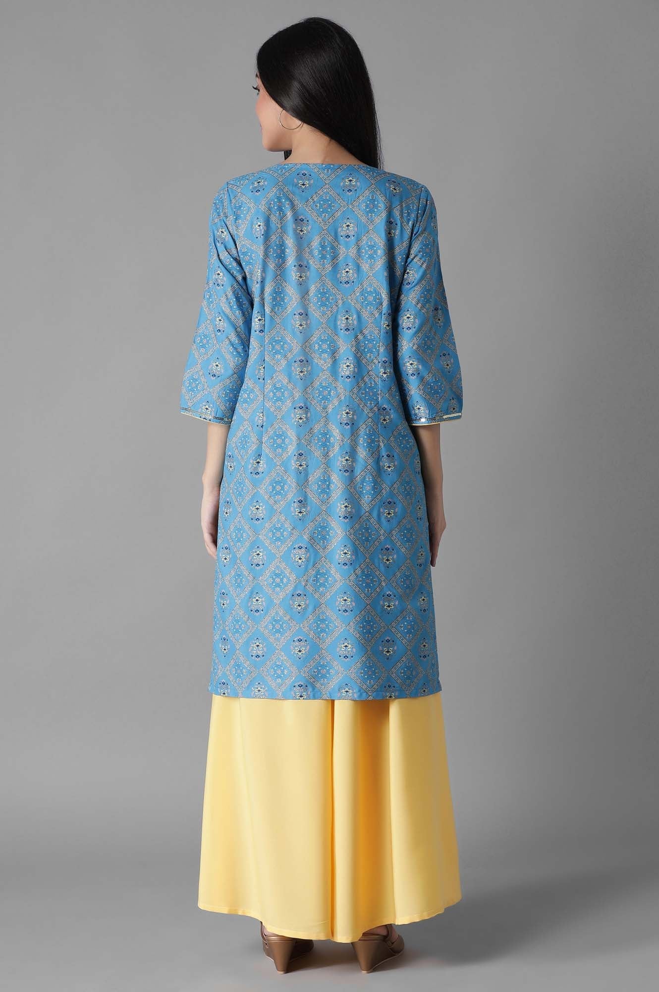 Be dressed la mode this festive season. Perfect for all occasions, this kurta set contains a vivid blue all-over mughal print panelled kurta having zari embroidered yoke with round neckline and three-quarter sleeves. Well-matched with ankle length solid flared palazzos.