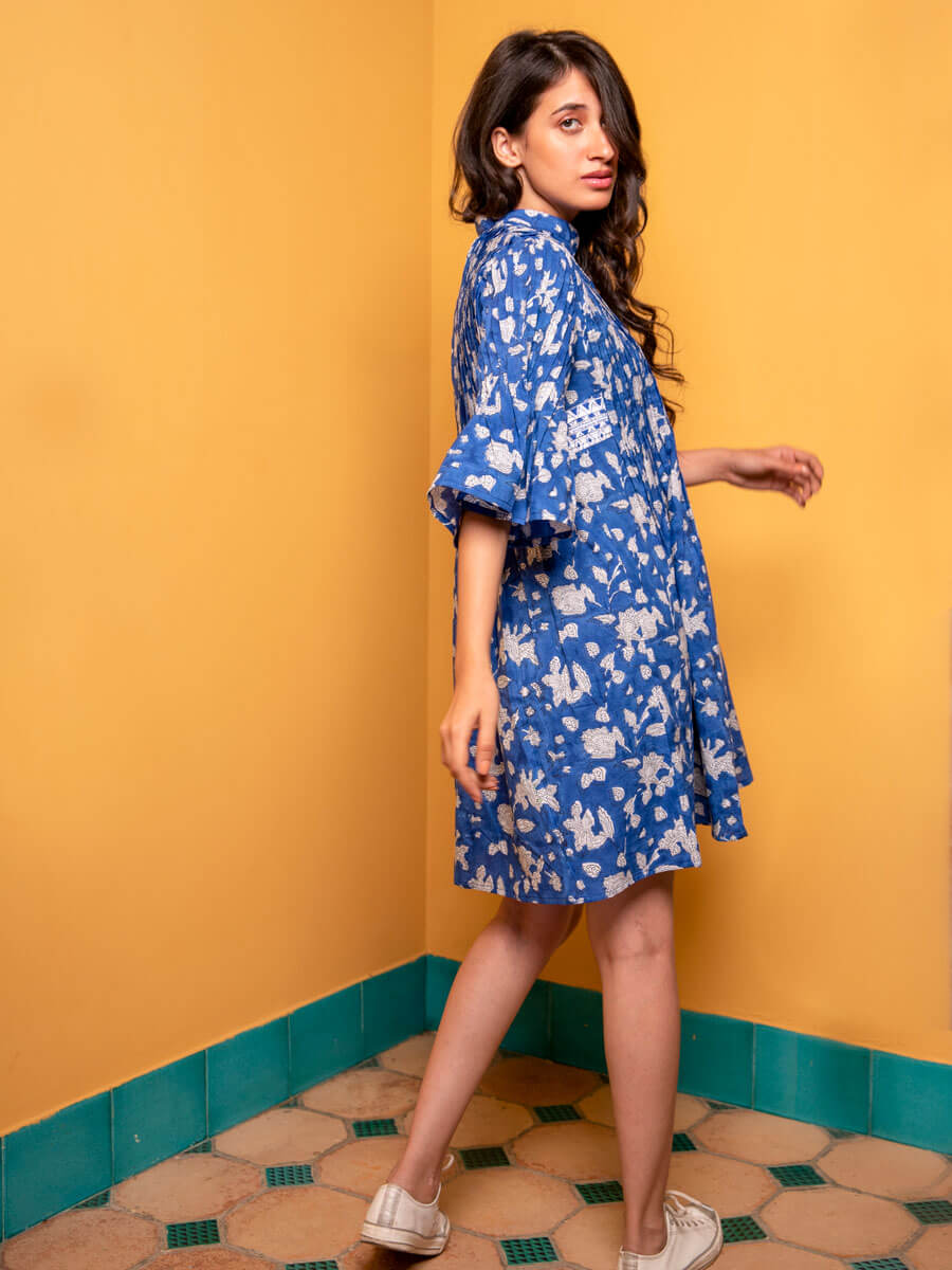 Blue Paradise Block Printed Cotton Pintuck Dress