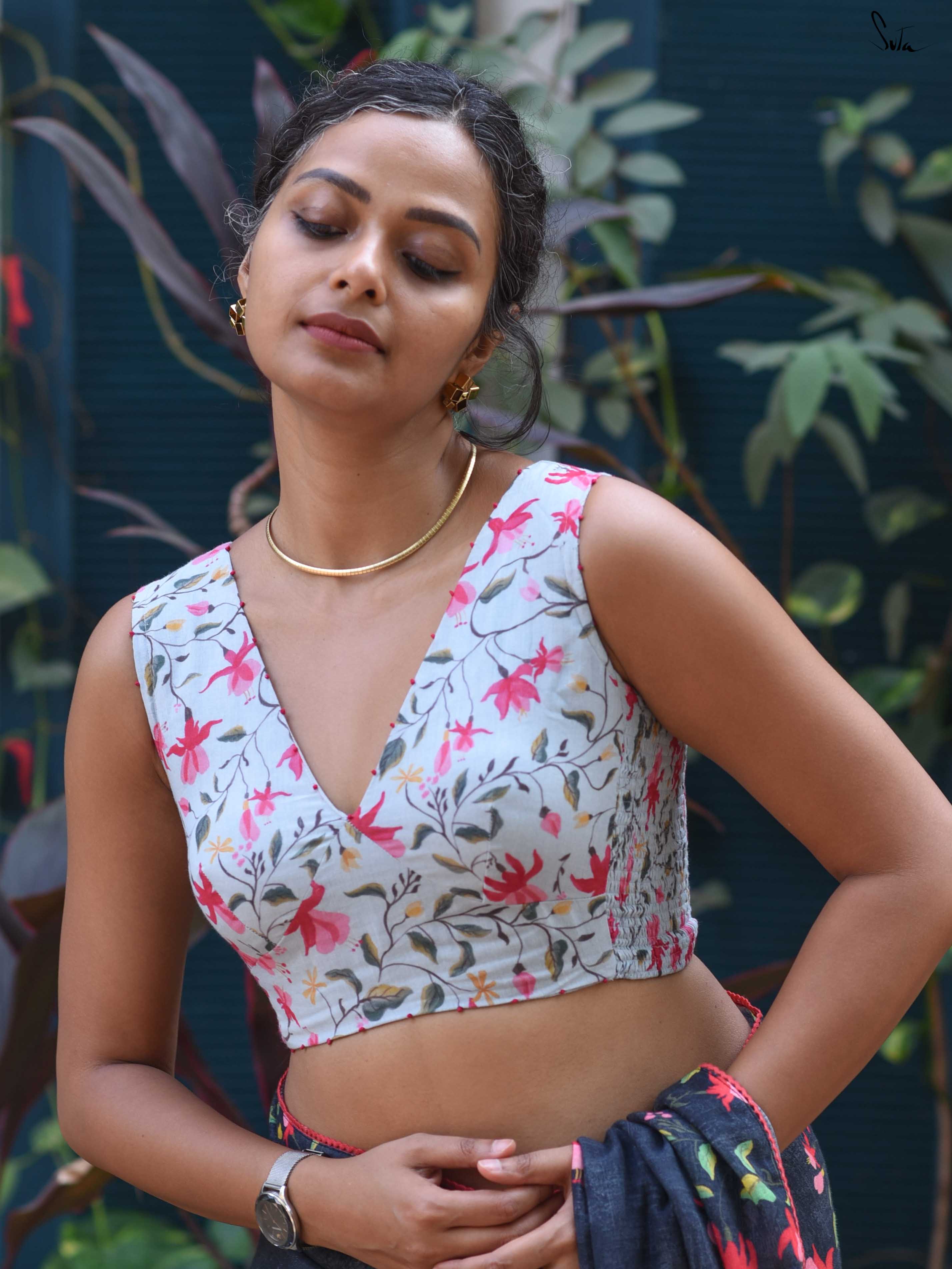 It features a blue base with digital floral prints and a flattering V neckline. Red French knot detailing along the neckline adds a subtle contrast and handcrafted touch. The sleeveless silhouette keeps the look light and versatile.
