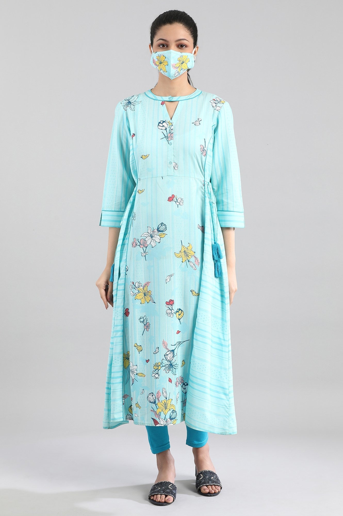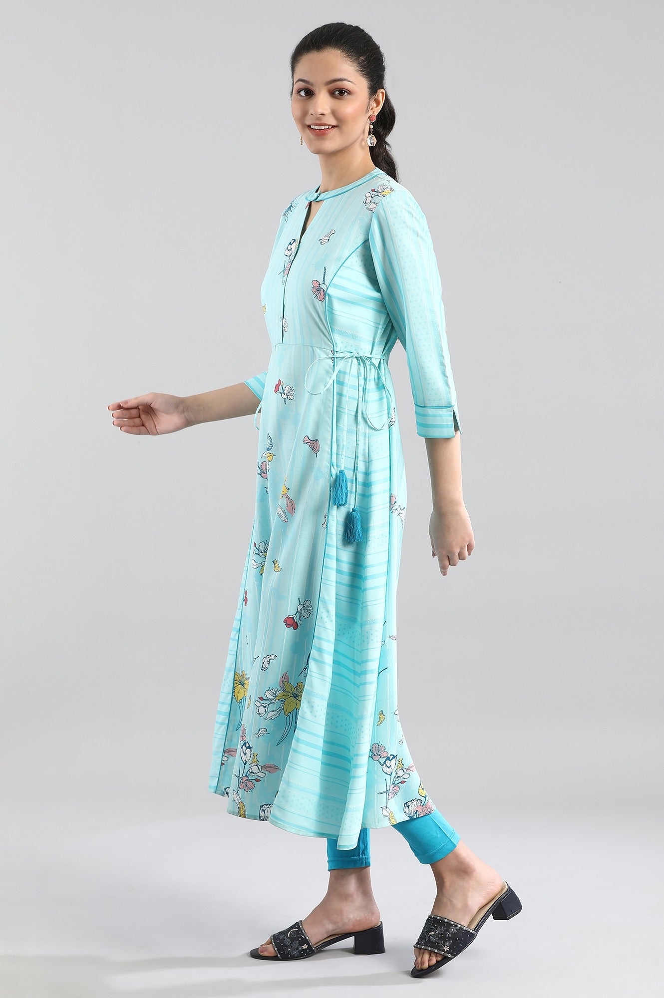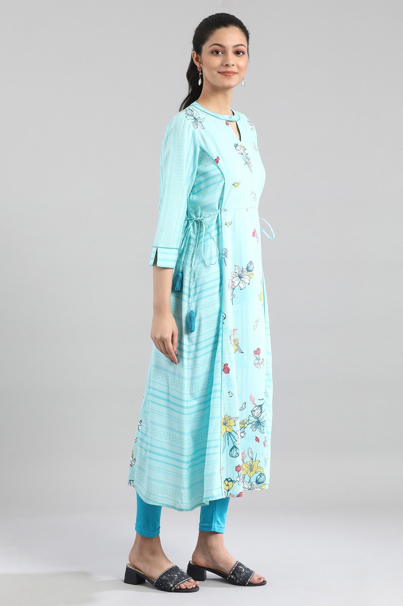 Blue printed A-line kurta in band with V neck and three-quarter sleeves with tassel tie-up.