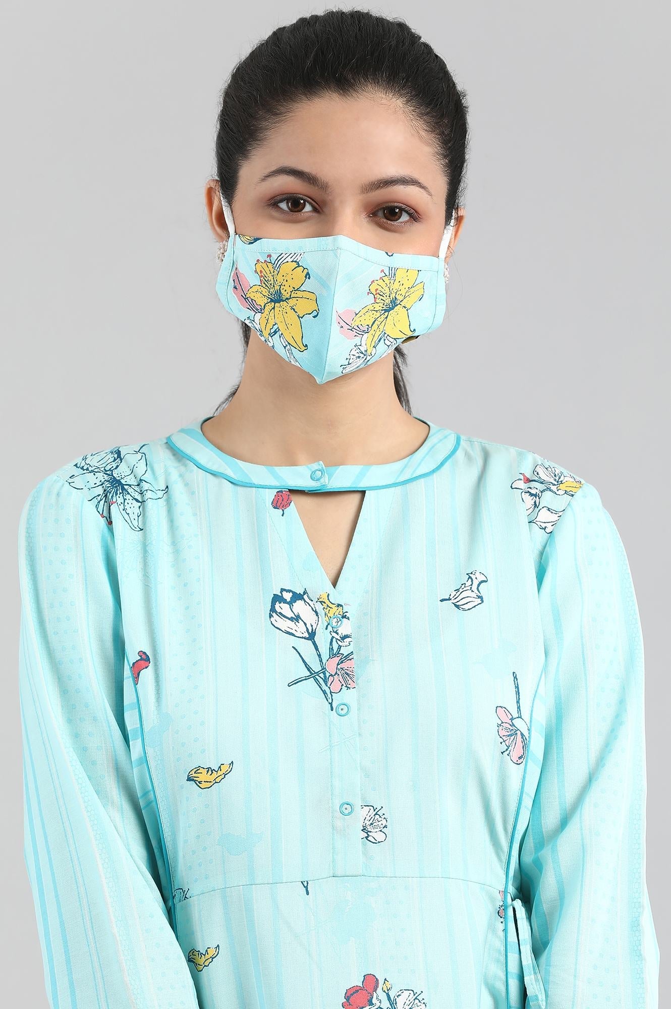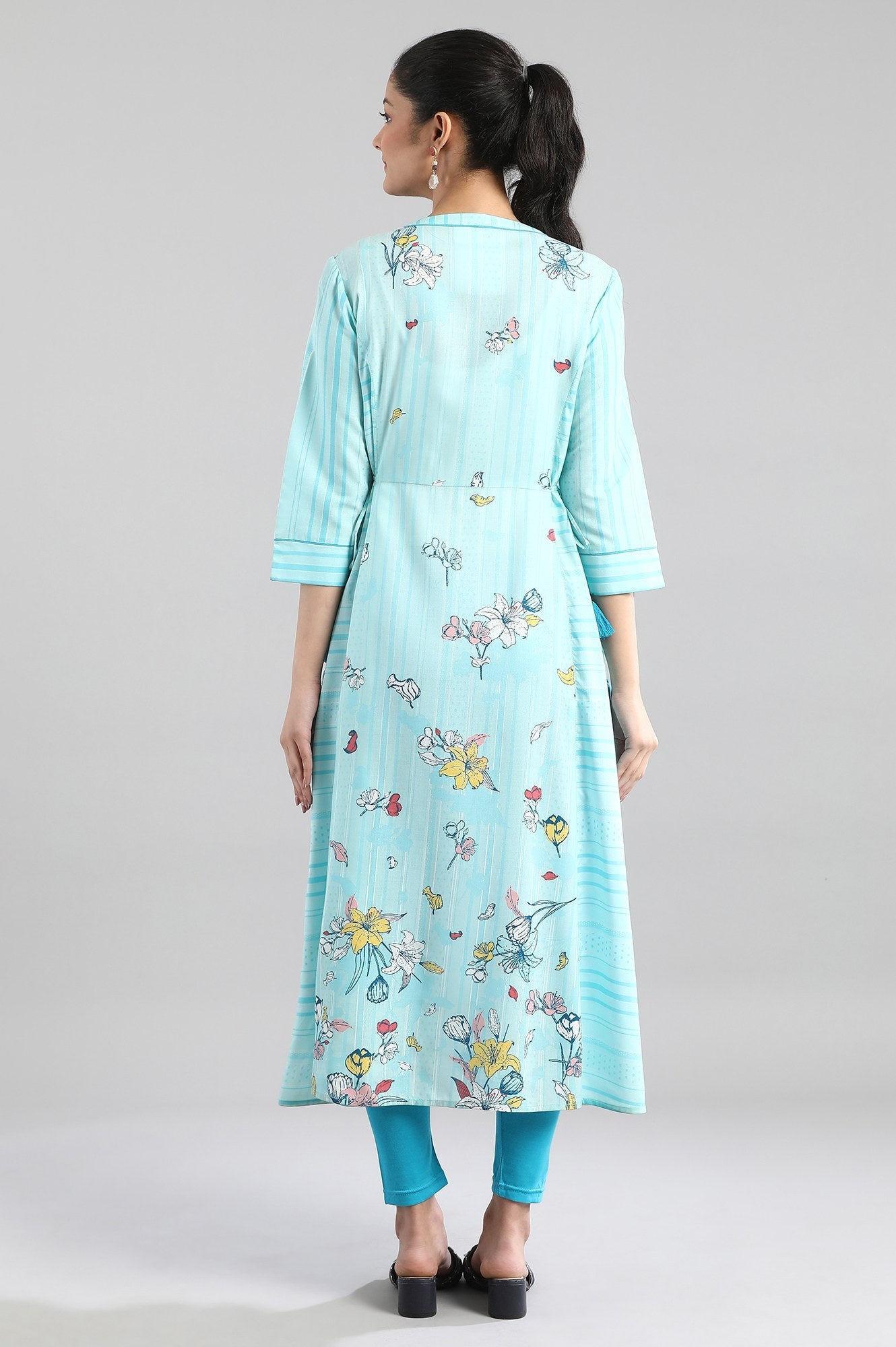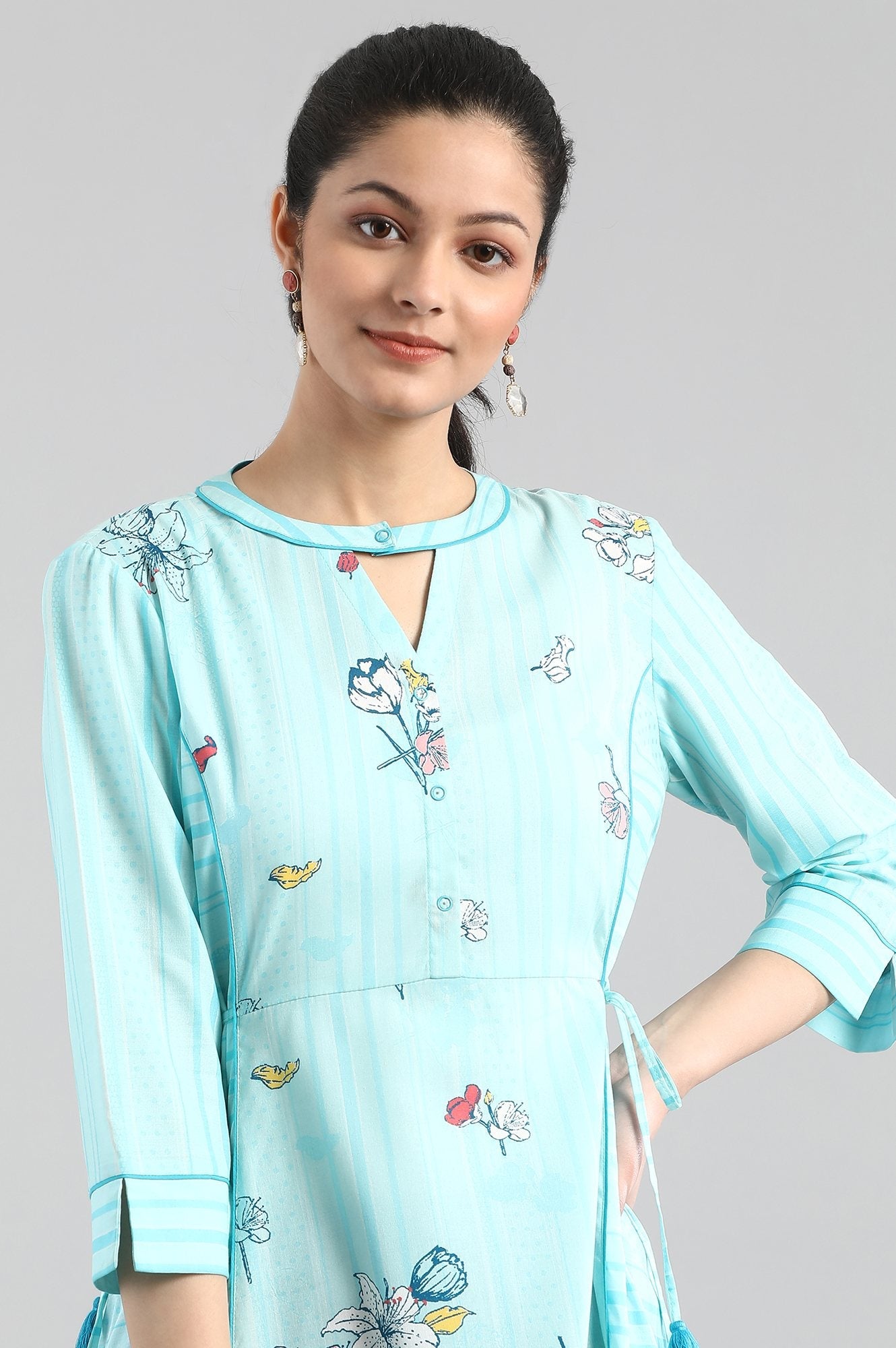 Blue printed A-line kurta in band with V neck and three-quarter sleeves with tassel tie-up.