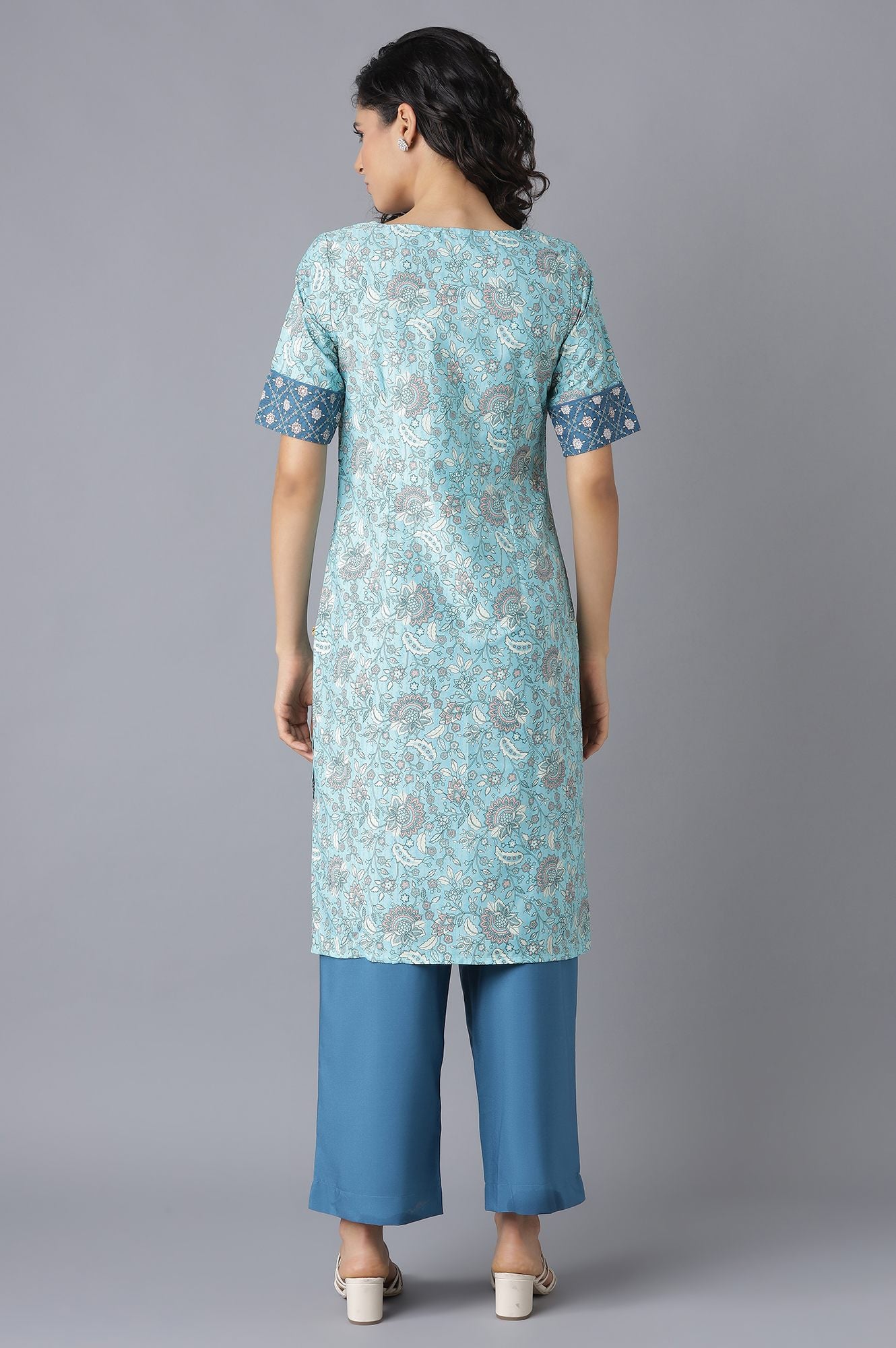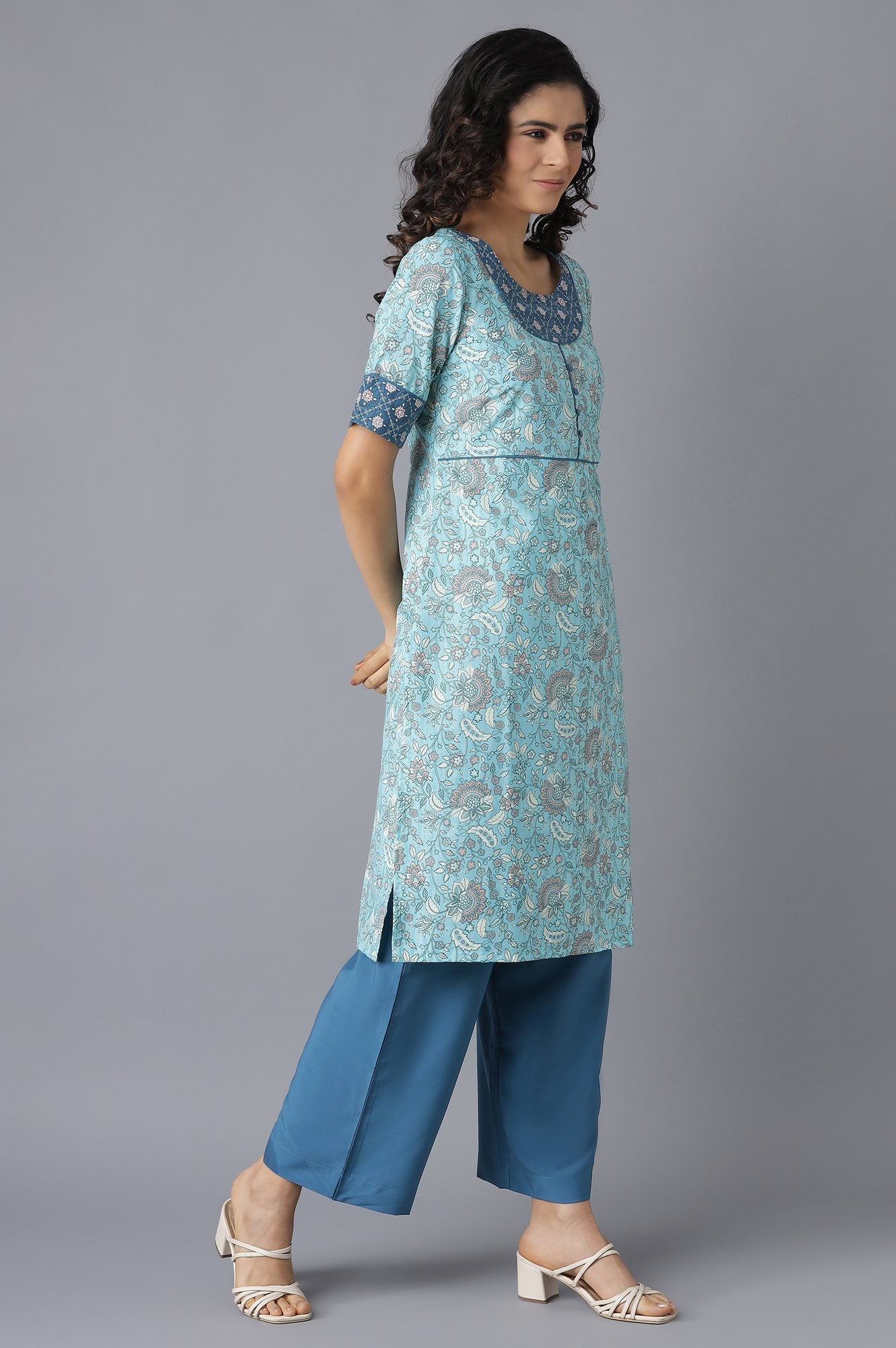 Rich in style and elegance, this ethnic set will turn heads where ever you go. The set includes blue straight fit kurta having elbow sleeves and floral motifs. And, it is paired with flared culottes tailored in high-rise and has elasticated waistband.