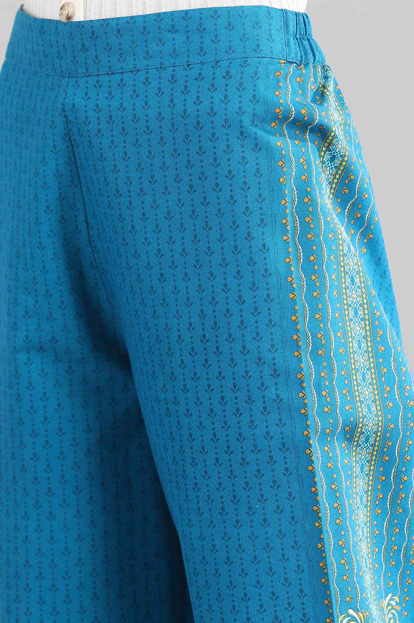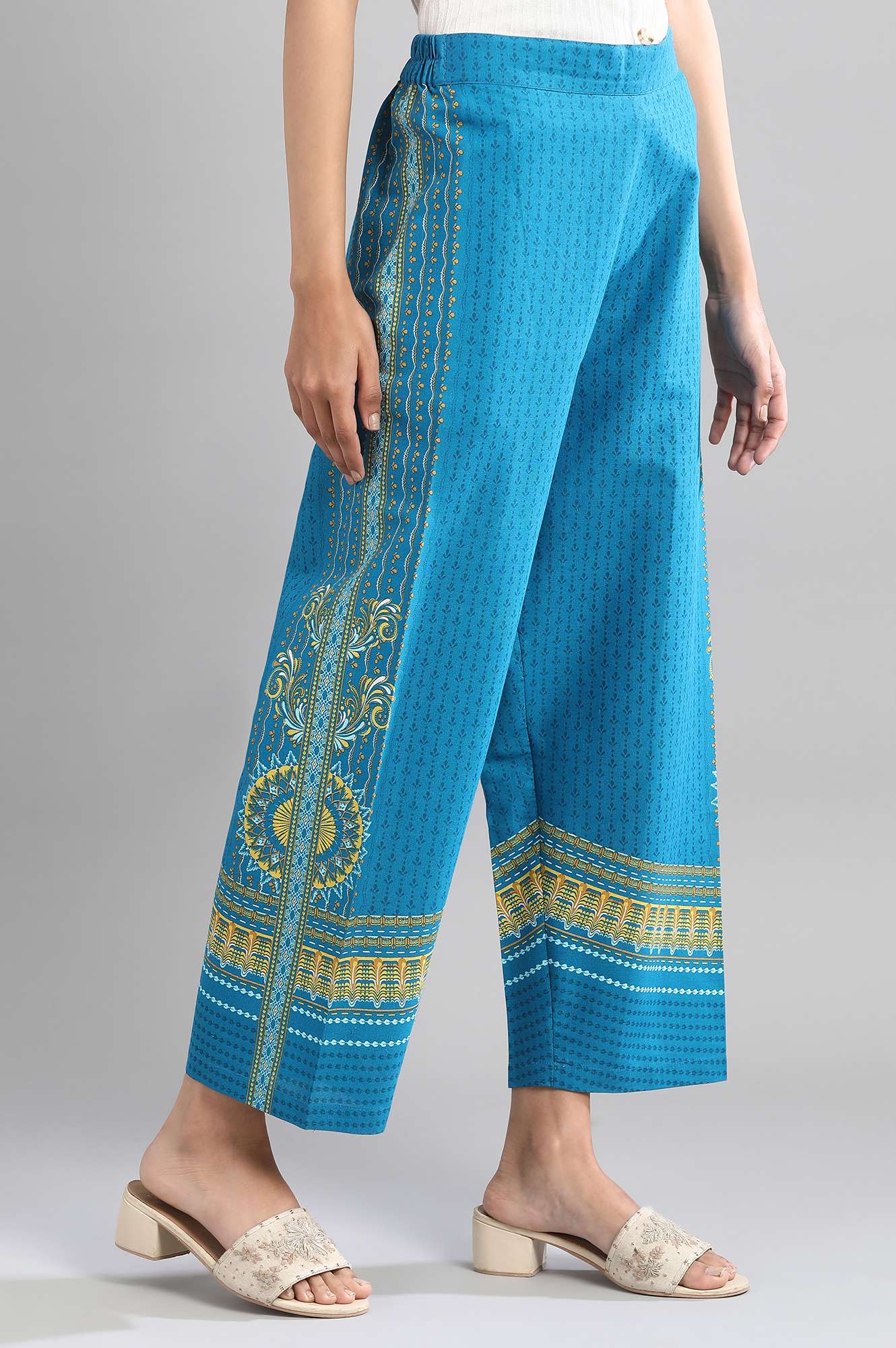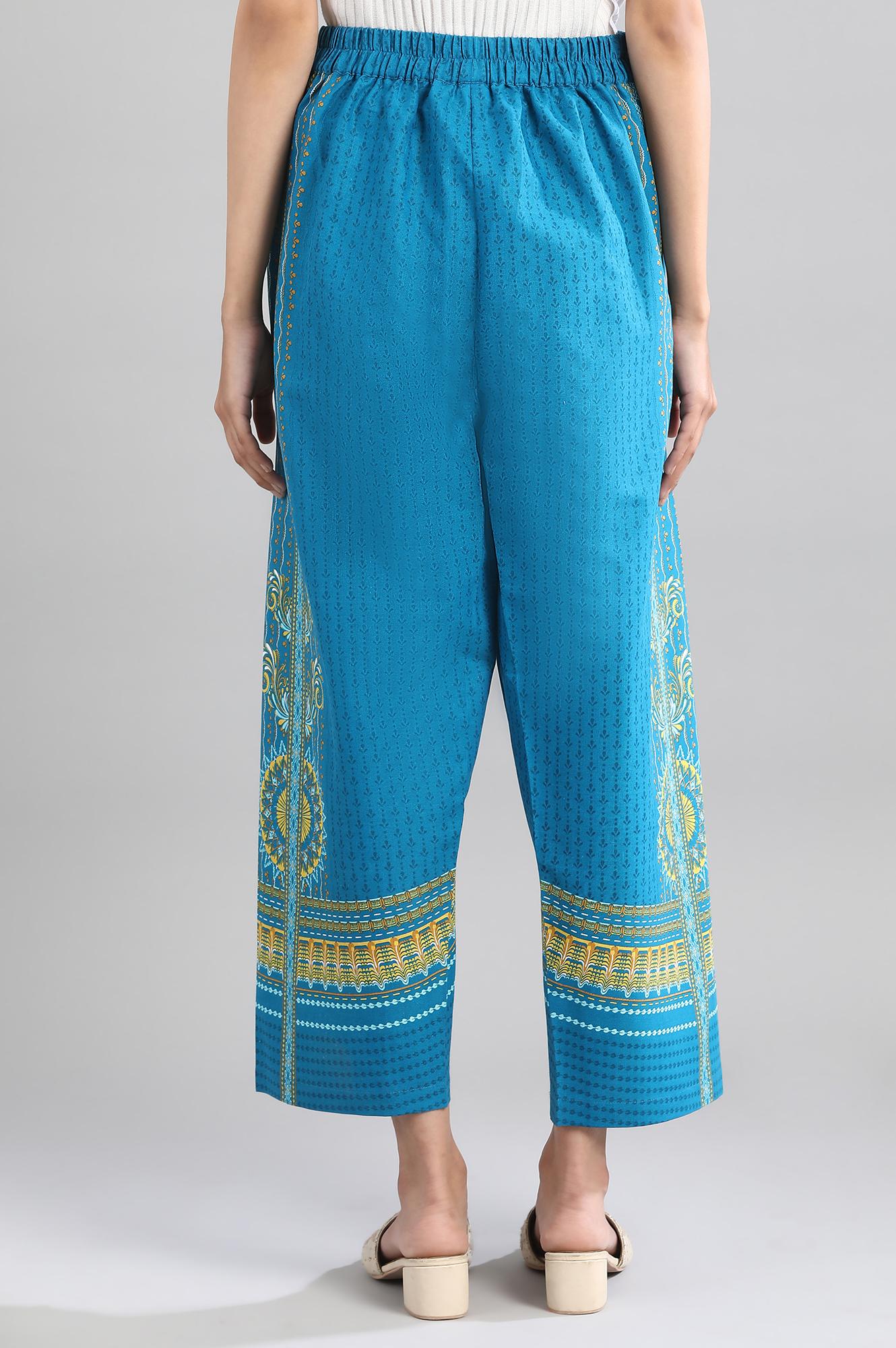 Loose fit ankle length sapphire blue palazzo pants in mid-rise with geometric print.