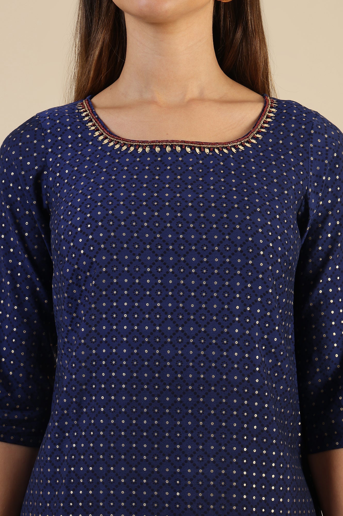 Elevate your style with this stunning knee-length kurta from brand A, perfect for special occasions. Crafted from a luxurious blend of 78% viscose and 22% polyester, this evening blue fusion piece combines comfort and elegance. The woven construction technique ensures durability, while the sequin and foil embellishments add a touch of glamour. The three-quarter sleeves and band neckline create a sophisticated silhouette, complemented by a stylish slit detail. This straight-cut kurta is designed to make you stand out at any event, seamlessly blending traditional and contemporary elements. The viscose blend fabric offers a soft, flowing drape that moves gracefully with you. Whether you're attending a festive gathering or a formal dinner, this kurta is sure to turn heads and make a lasting impression. Its versatile design allows for easy styling with various bottoms and accessories, making it a valuable addition to your wardrobe. Experience the perfect fusion of comfort and style with this exquisite evening blue kurta from brand A.