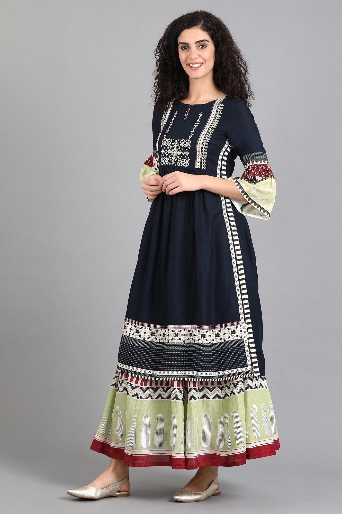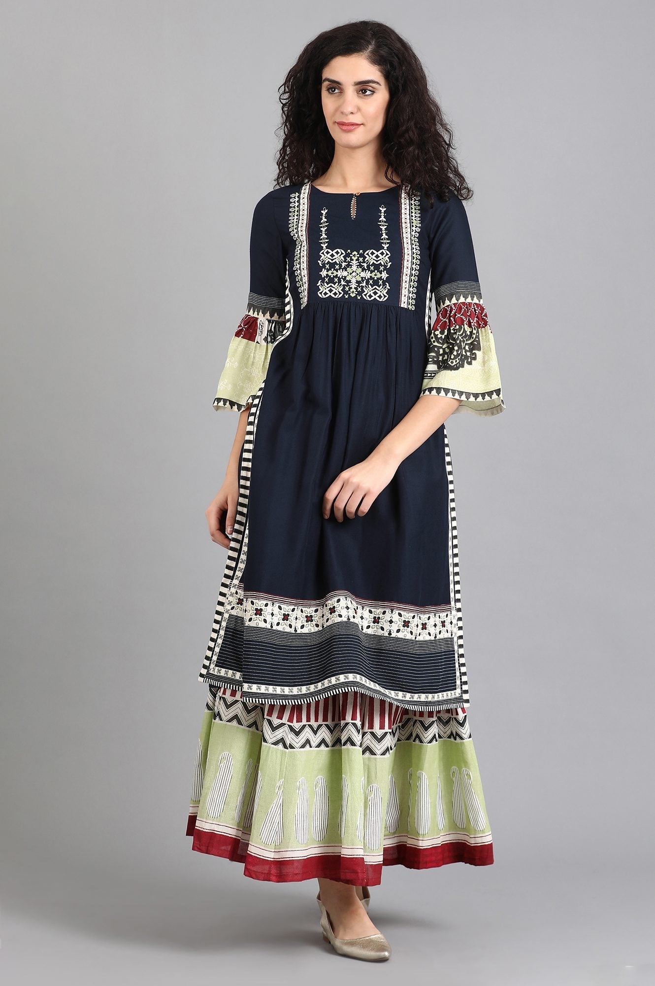Blue round neck kurta with fit & flare sleeves, yoke detail along with bottom hem. Complete your look with ecru printed skirt or green dupatta. You can also tag it with contrasting churidar and ring-toed flats.