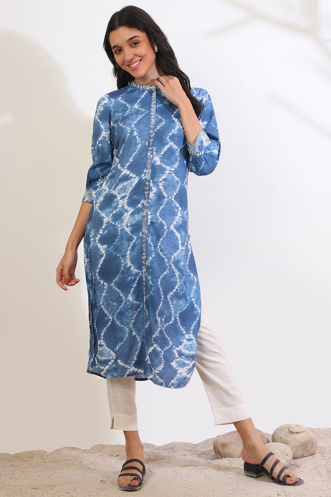 Blue Shibori Printed Dori Embroidered Rayon Twill Straight Kurta