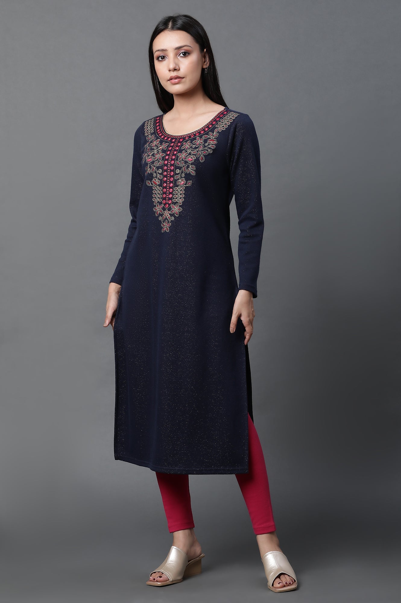 Blue Warm Jacquard Winter Kurta and Tights Set