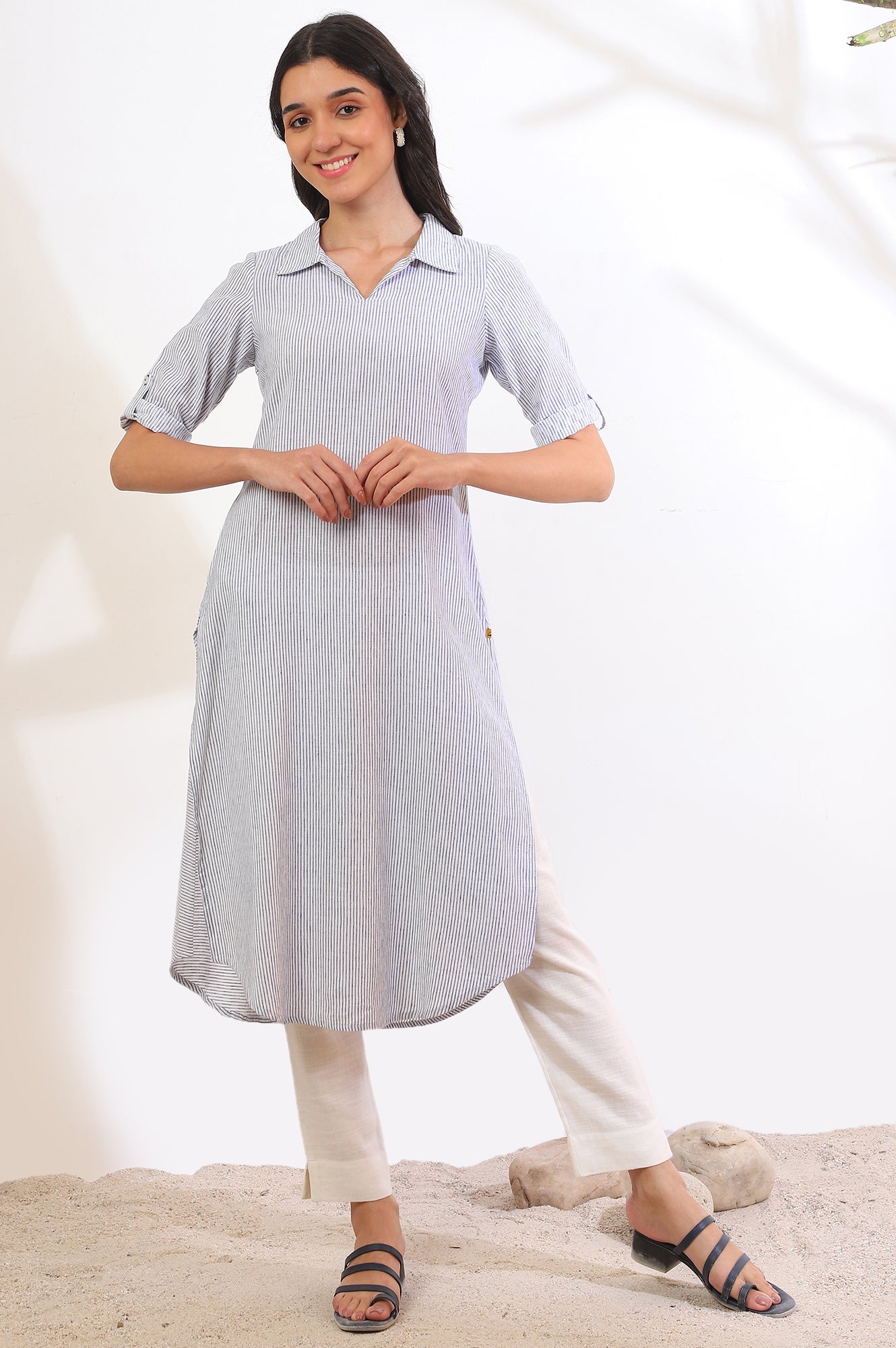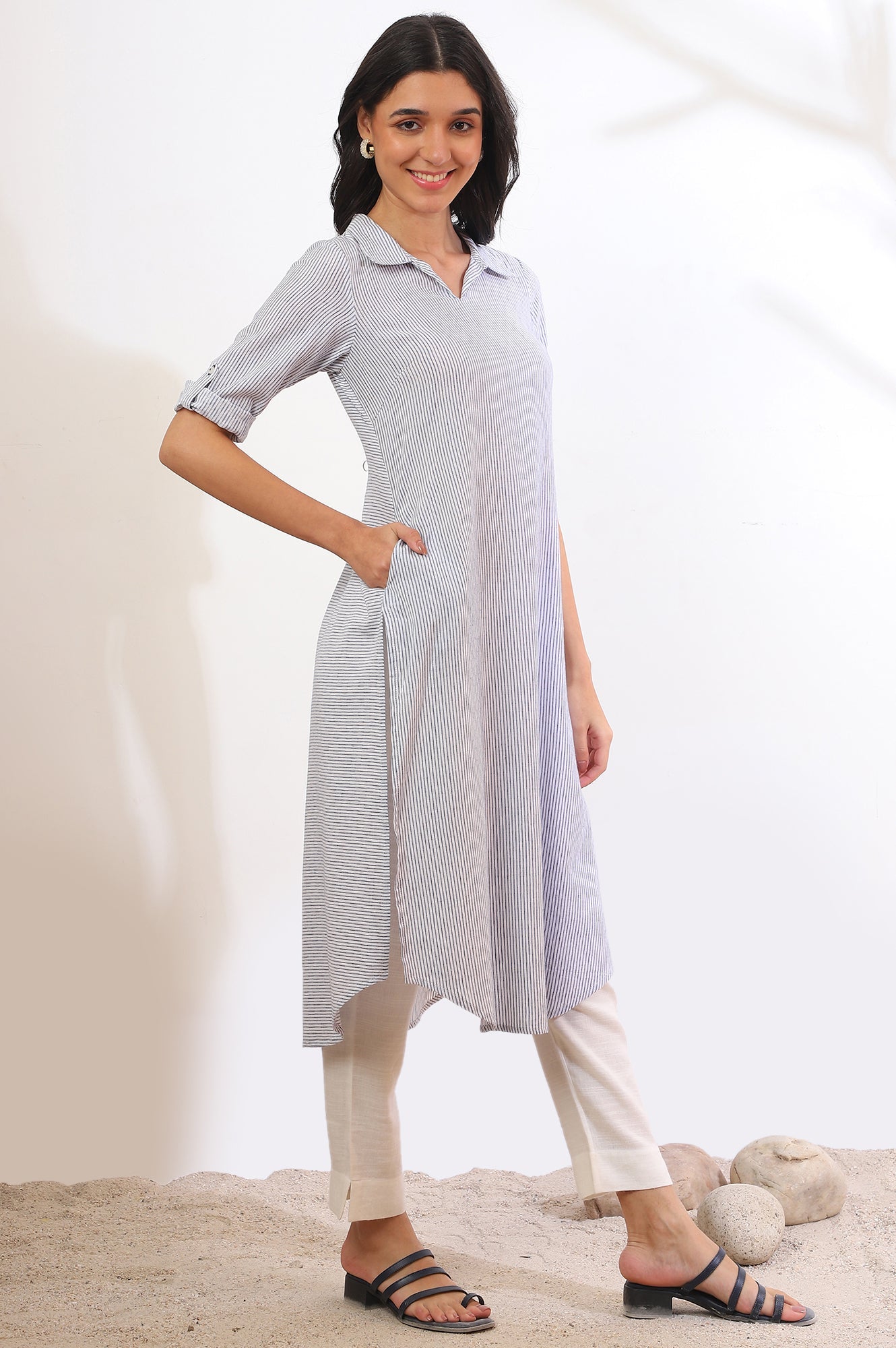 Blue Yarn Dyed Straight Cotton Flax Kurta