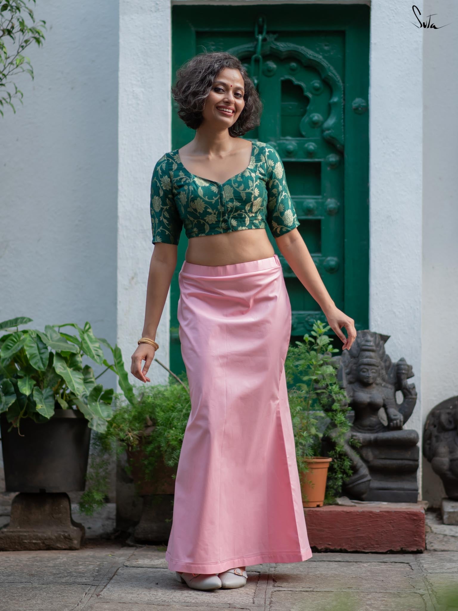 Crafted from luxurious cotton lycra fabric, the stunning underskirt in radiant light pink is all you need for the desired saree drape. The stretchable design ensures a comfortable fit, making it a beloved choice among women to pair with their favorite sarees and lehengas.