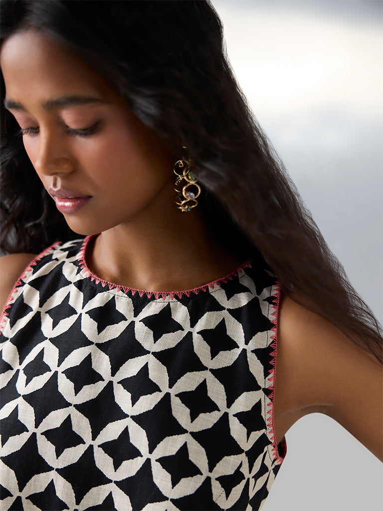 Bombay Paisley introduces this black shift dress, detailed with bold prints and floral patterns along the hem. Cut with a round neck and a sleeveless profile, it is crafted from cotton-rich fabric that feels soft and breathable. A chic design that blends everyday ease with a touch of statement style.