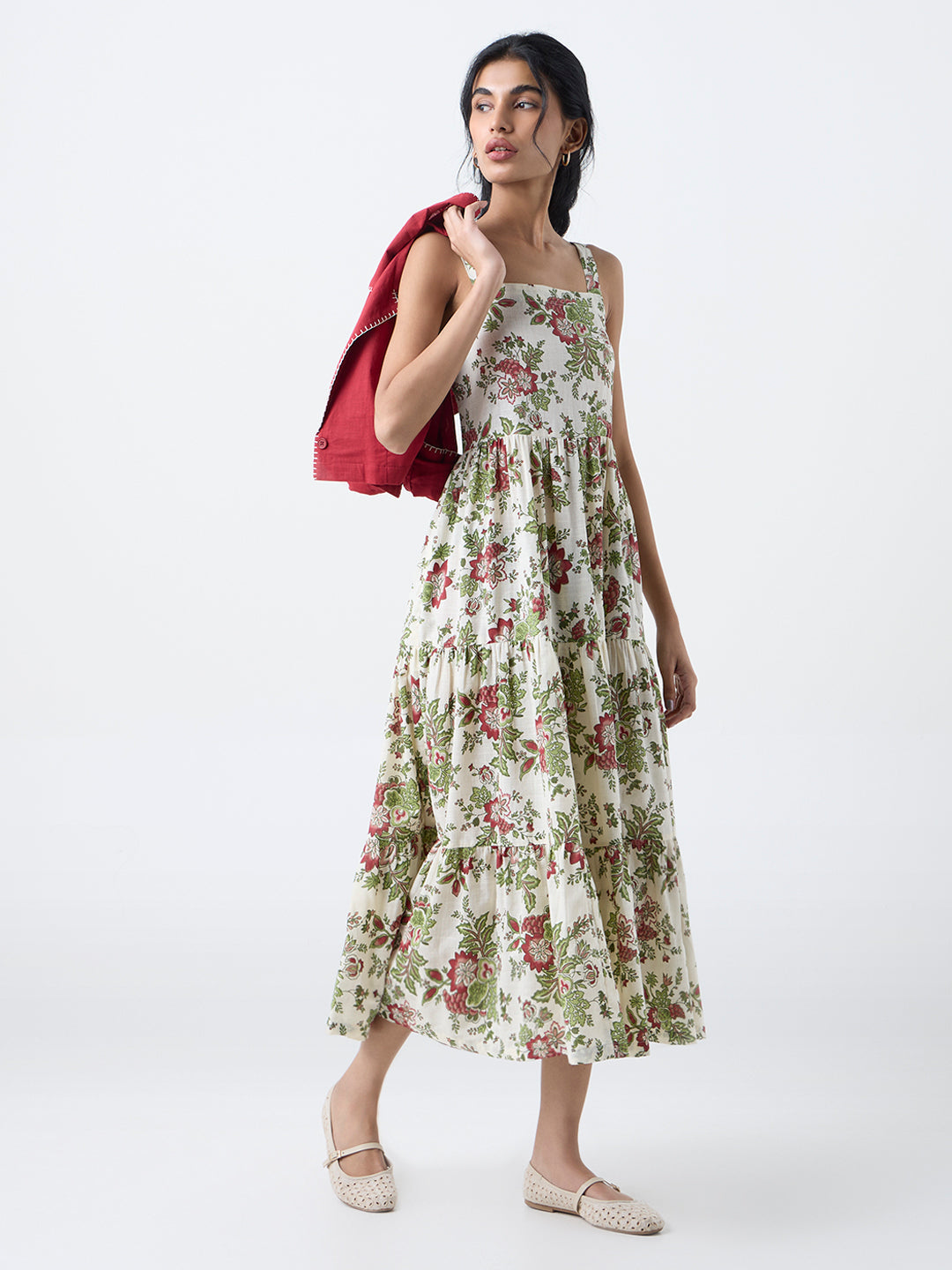 Bombay Paisley brings a touch of wanderlust to your wardrobe with this cream tiered dress, beautifully detailed with botanical motifs that lend a soft, handcrafted charm. The square neckline and adjustable straps create a flattering, easy-going silhouette, while the pure cotton fabric keeps the look breezy and natural. Paired with a vibrant red crop jacket, the ensemble comes alive with festive contrast.