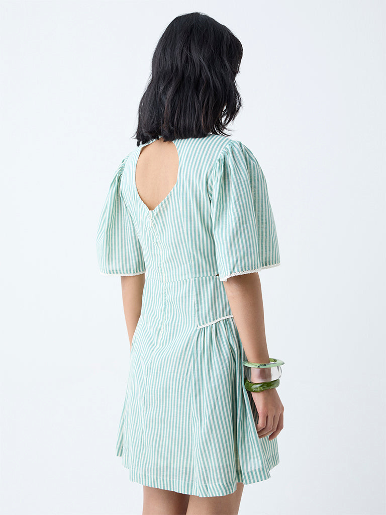 Made for intimate soirees, this green dress from Bombay Paisley pairs stripes with floral prints for a playful charm. The round neck and angel sleeves keep the look breezy, while cut-out detailing at the waist adds a touch of edge. Shaped in an A-line silhouette, it brings an effortless feminine appeal.