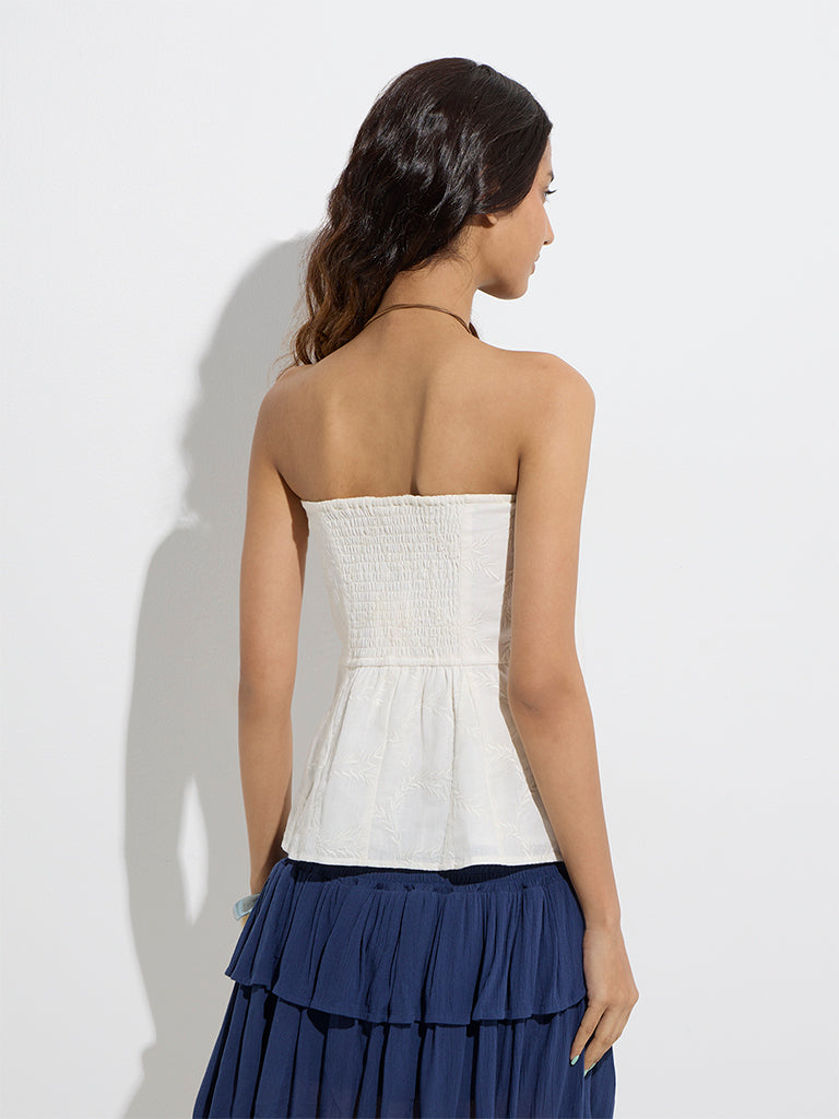 Bombay Paisley introduces this off-white tube top, fashioned with leaf embroidery for a touch of nature-inspired charm. Crafted from a luxurious cotton-linen blend, it features a flattering peplum silhouette and a smocked back that offers gentle structure while keeping the look breezy and feminine.