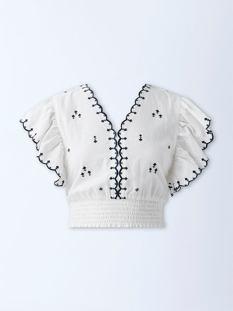 This off-white top from Bombay Paisley captures a breezy charm with its intricate floral embroidery and vintage-inspired angel sleeves. Crafted from pure cotton for all-day comfort, the design is framed by a flattering V-neck and finished with a smocked waist that cinches the silhouette.