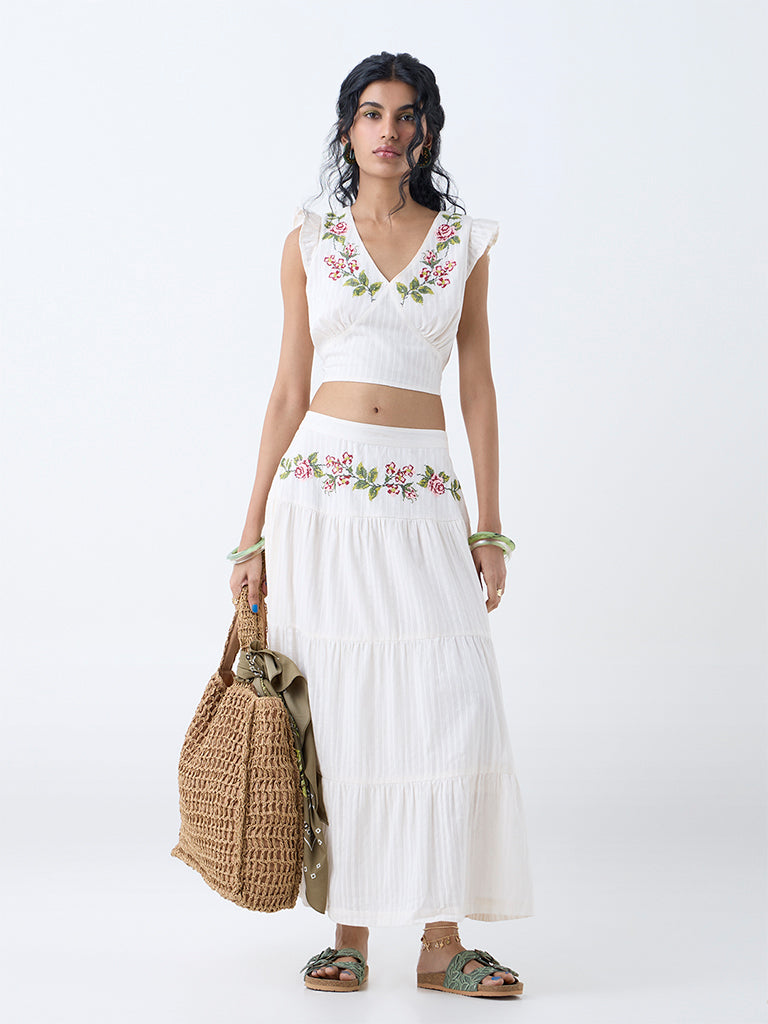 Bring effortless charm to your warm-weather assortment with this off-white top from Bombay Paisley. Vivid floral embroidery is decked across the breathable fabric, while a flattering V-neck and flutter sleeves add a feminine touch. Finished with a flexible elastic waistband, this lightweight creation blends comfort with casual elegance.