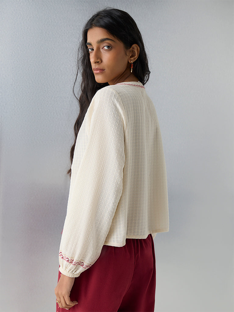 This off-white top from Bombay Paisley is crafted from breathable cotton with a subtle texture. Detailed with delicate embroidery, it features a split neck with a tassel-detailed tie-up for added style. Finished with blouson sleeves, it blends artisanal charm with everyday elegance.