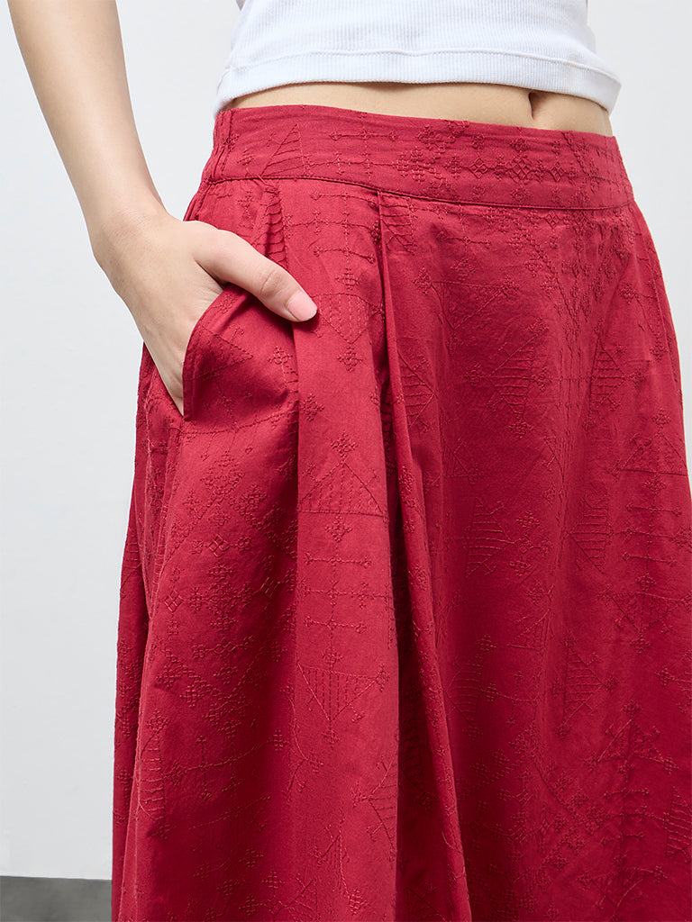 Bombay Paisley presents this red embroidered high rise skirt crafted from pure cotton for breathable comfort. Designed with an elasticated waistband, it falls into a flattering fit and flare silhouette. Regular side pockets add everyday functionality, while the delicate embroidery lends a contemporary, refined finish suited for easy, stylish dressing.