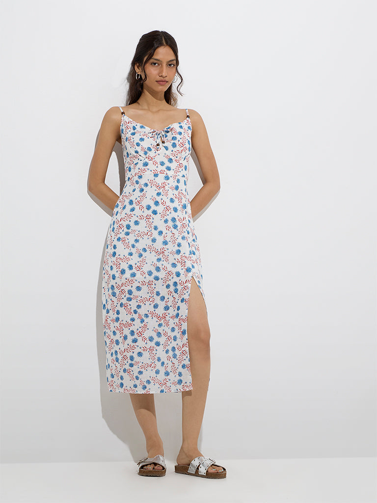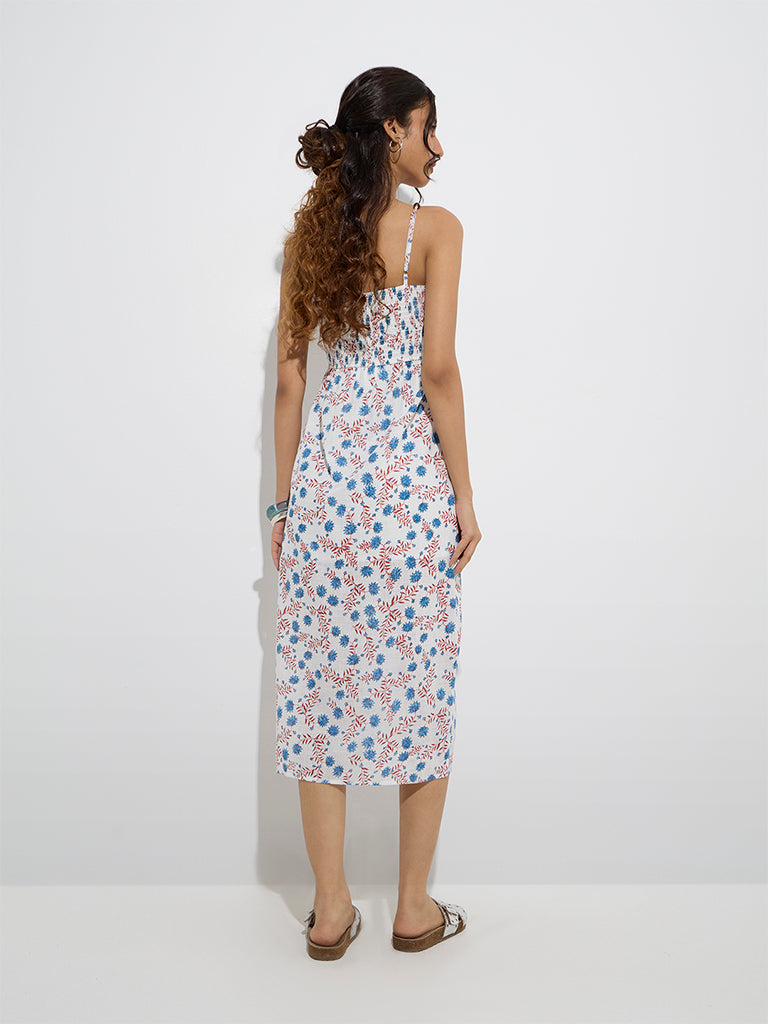 Bombay Paisley launches this white dress decked with floral motifs that enhance its feminine charm. Woven from pure cotton, it features a flattering V-neck with tie-up detailing, adjustable straps, and a smocked back for a comfortable fit. A slit at the front adds a sleek touch to the breezy silhouette.