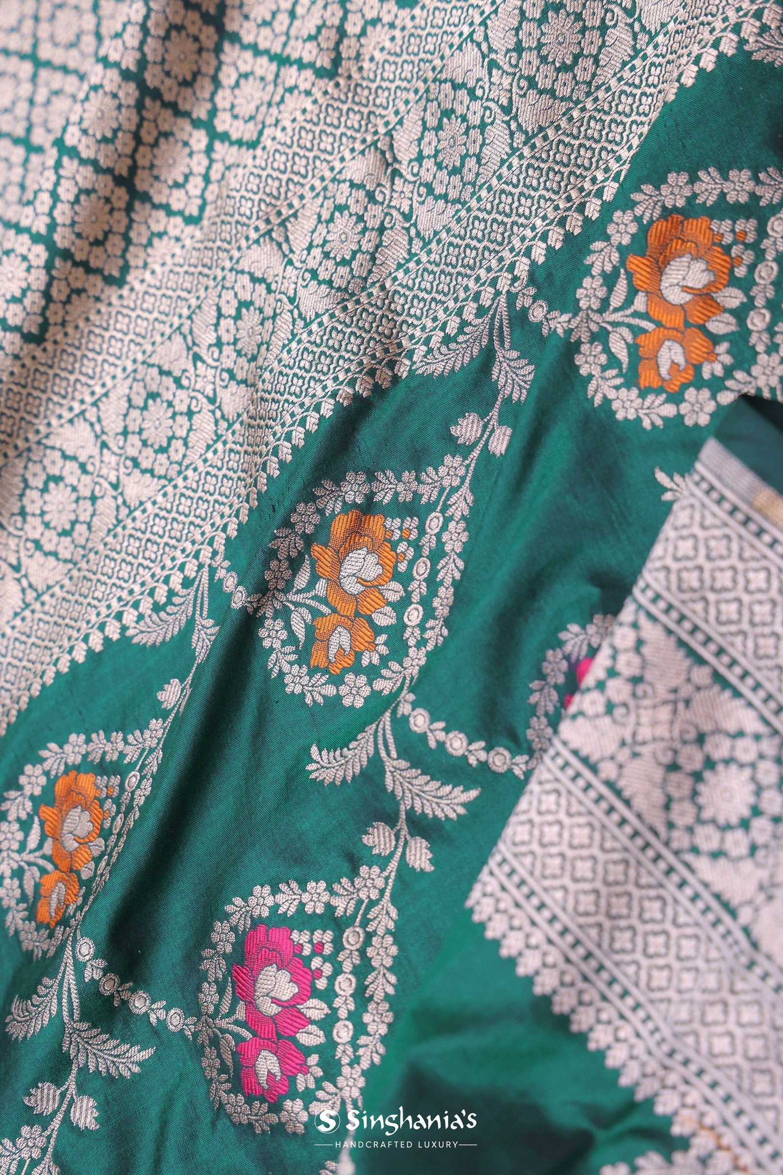 Bottle Green Banarasi Silk Saree With Meenakari Design