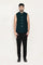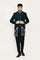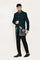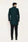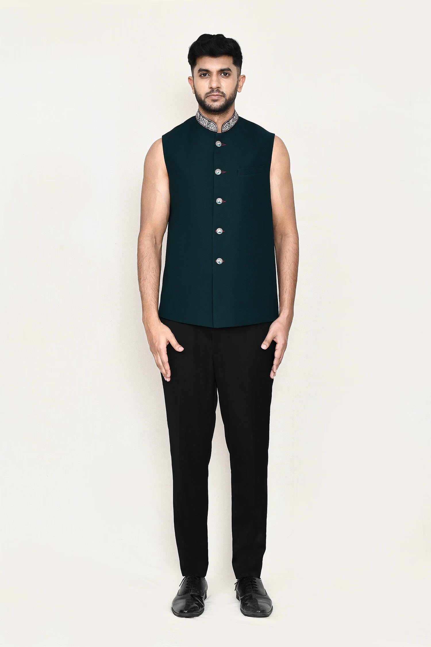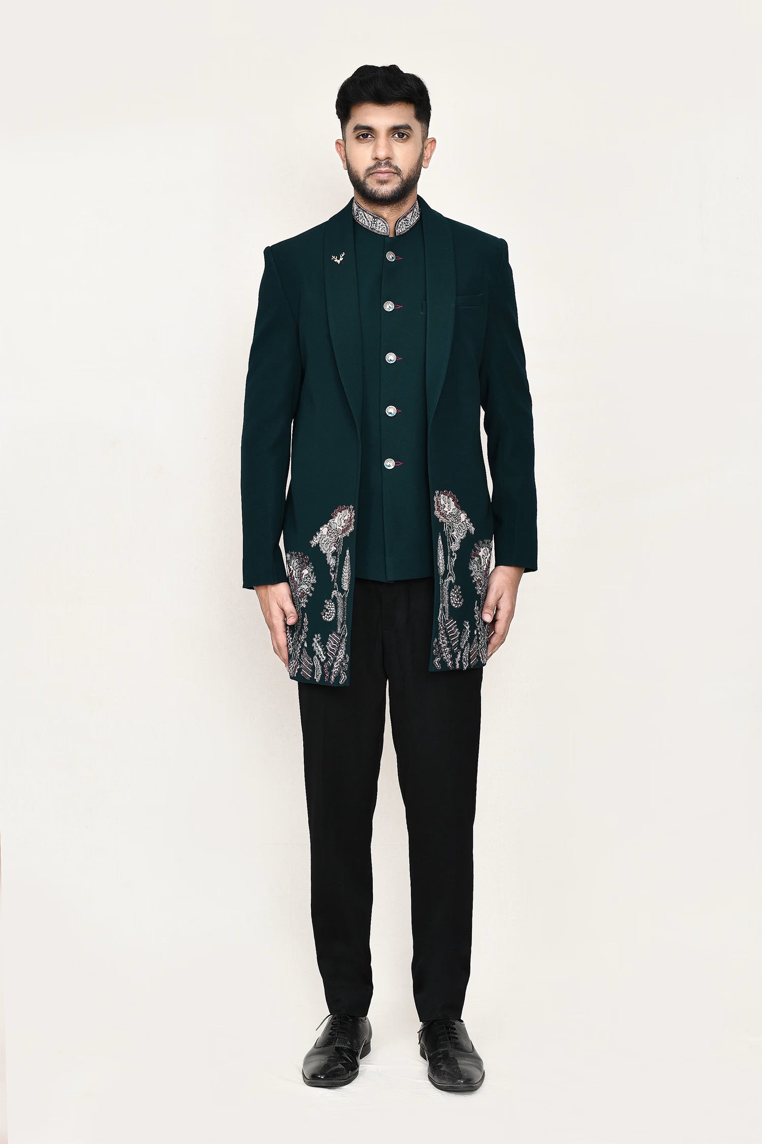 This bottle green polyester three piece suit set has open prince coat which has embroidery work done on both the sides paired with black pant, makes it simple and graceful to wear it at any formal occasion with a bow.