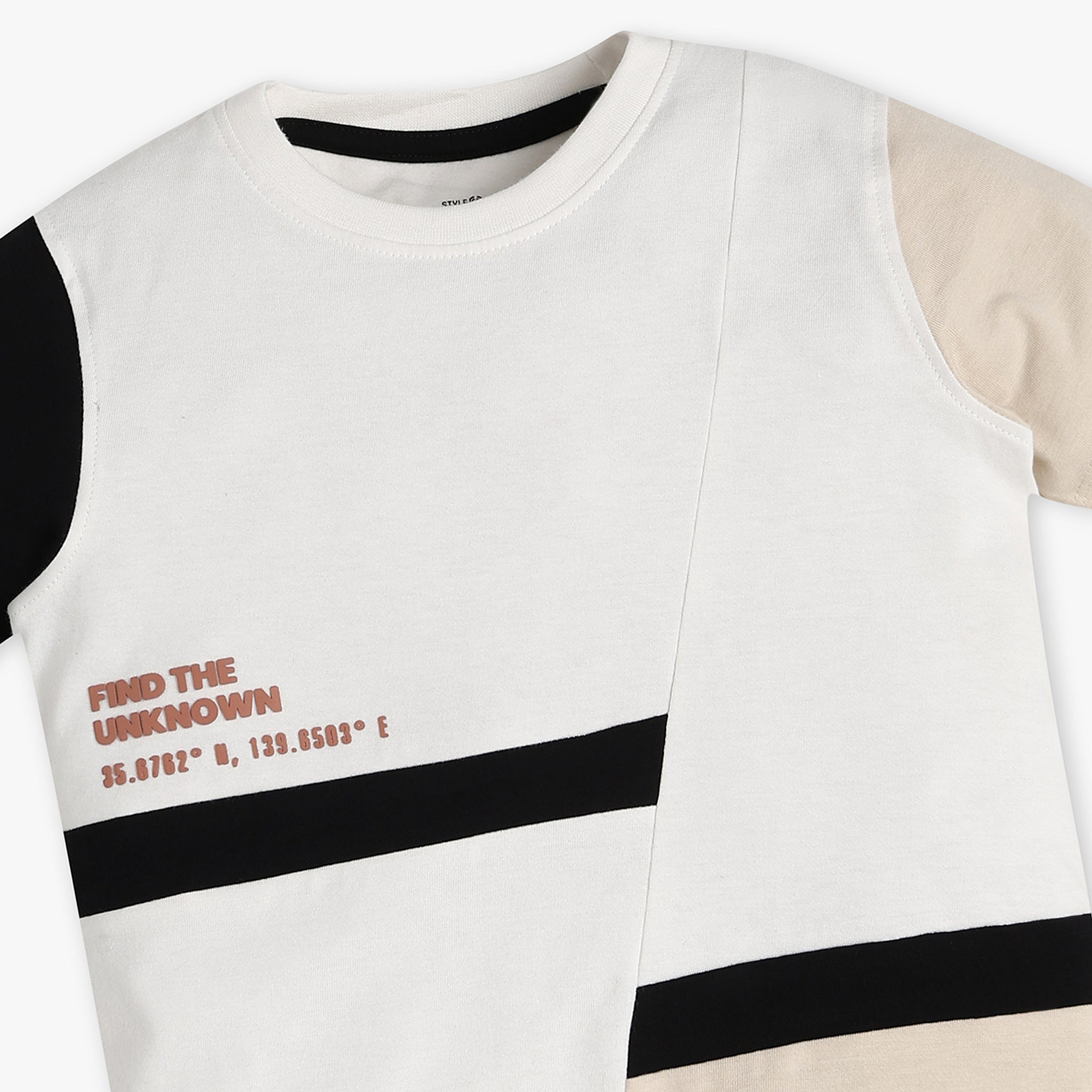 Experience the perfect blend of comfort and style with our Boys Cut & Sew T-Shirt. Crafted from 100% cotton, this t-shirt offers a soft touch against the skin, making it ideal for all-day wear. The knit weave ensures flexibility and breathability, keeping your little one comfortable during playtime or casual outings.