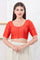 The bright red solid dupion silk blouse with elbow length sleeves for a neat traditional look.