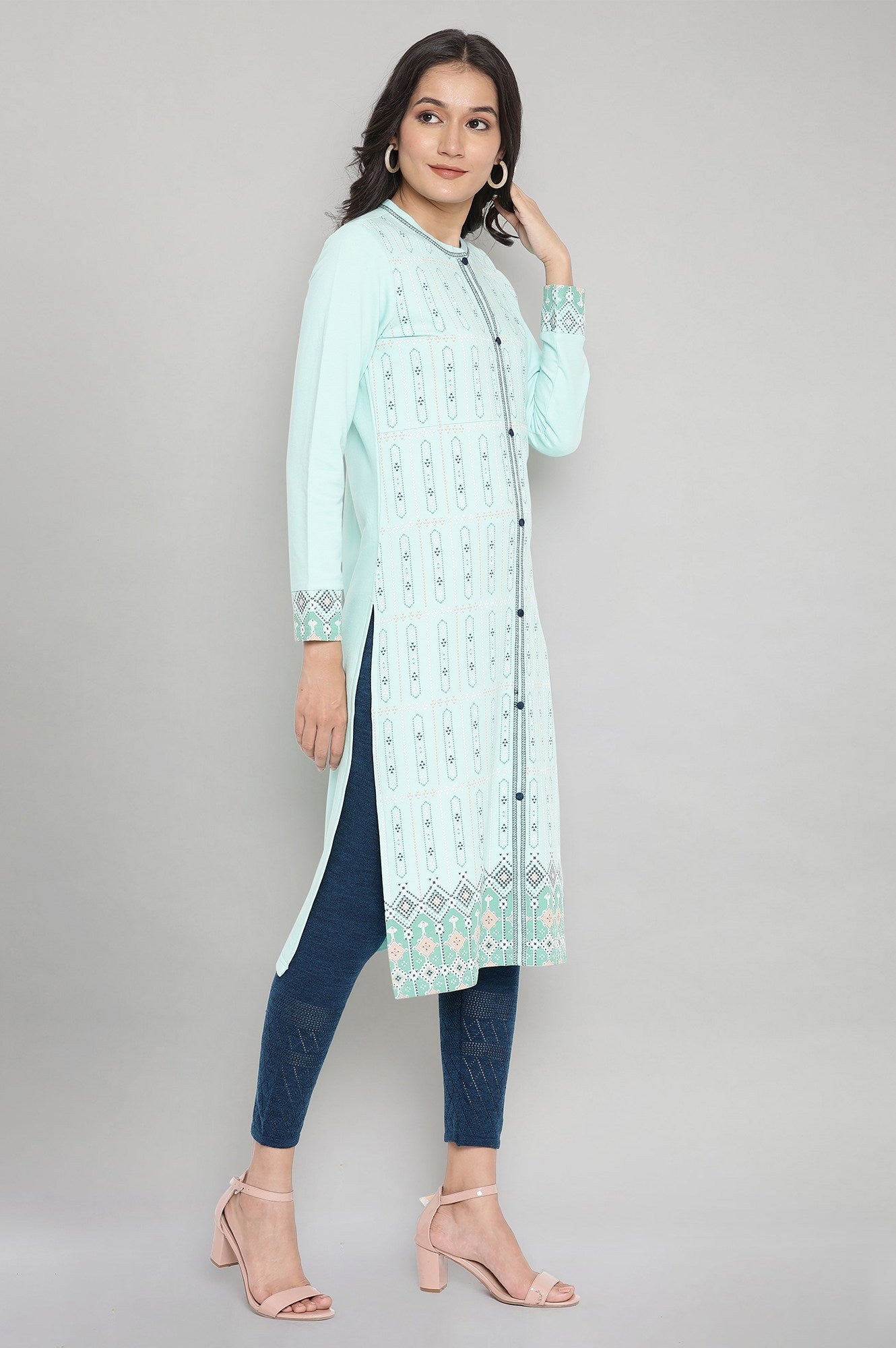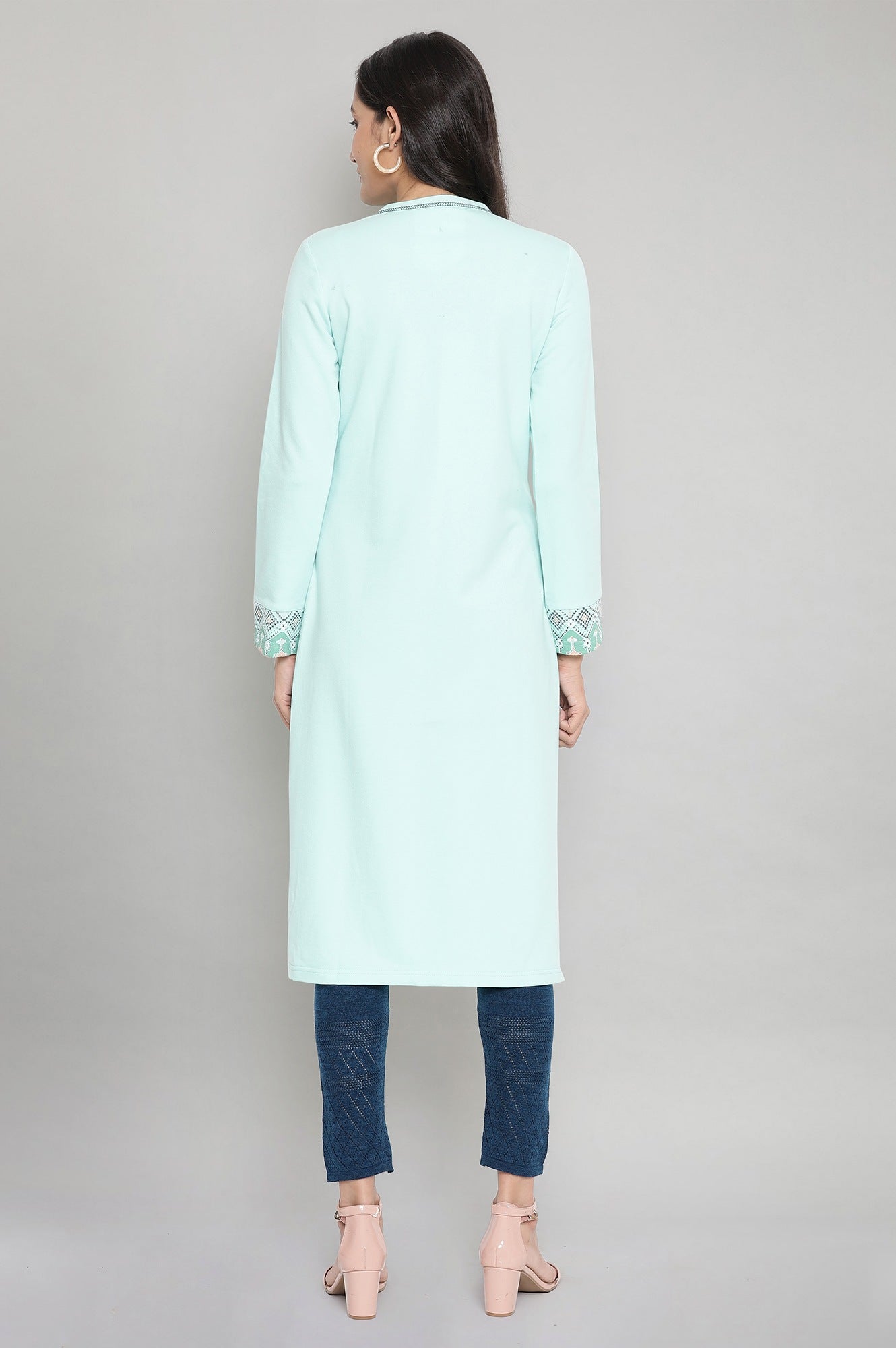 Fusing traditional silhouette with western design, this knitted kurta by Aurelia is a must-have addition to your winter wardrobe. It features geometric print all over and band collar with button placket.